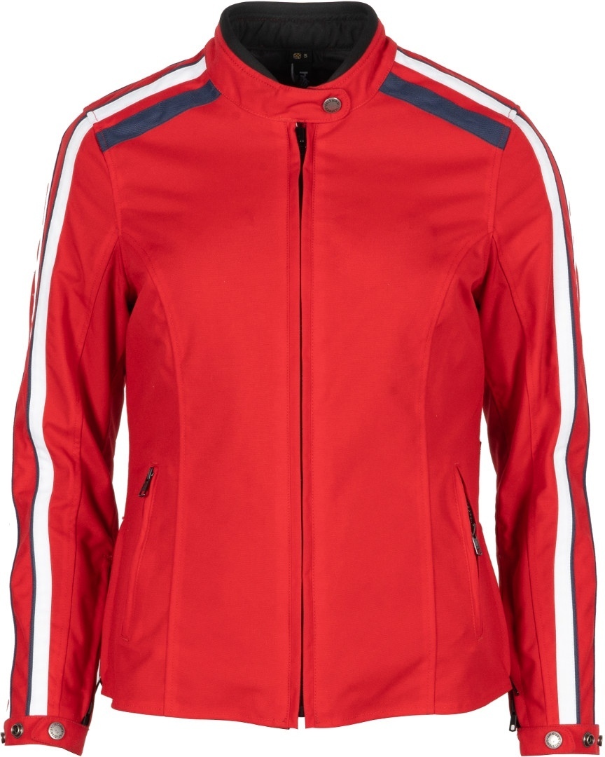 Красная демисезонная женская мотокуртка Helstons Jade Tissu Technique со съемным теплым терможилетом Thermo-Alu. Сшита из прочной красной термоткани, устойчивой на разрыв и пропитанной для влагозащиты. Фиксированная подкладка выполнена из эластичной сетки и снабжена 2 карманами на молниях. Еще 2 кармана на молниях есть на самой куртке и 2 кармана - на съемном жилете. Мотокуртка застегивается на центральную застежку-молнию без защитной планки. Для подгонки по фигуре используются молнии в боковых швах на бедрах и 3-позиционные хлястики-утяжки в области талии с фиксацией на кнопку. Также при помощи молний и утяжек регулируется ширины рукавов и манжет. Декоративные сине-белые полосы настрочены на плечах и рукавах. Количество декоративных элементов минимально, что делает слегка приталенную мотокуртку стильной и элегантной.