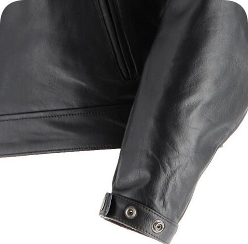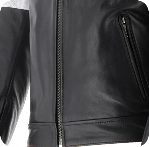 Кожа буйвола толщиной от 1,1 до 1,2 мм. Внутренняя фиксированная подкладка из смеси хлопка и полиэстера, покрывающая как корпус, так и рукава, с двумя внутренними карманами.