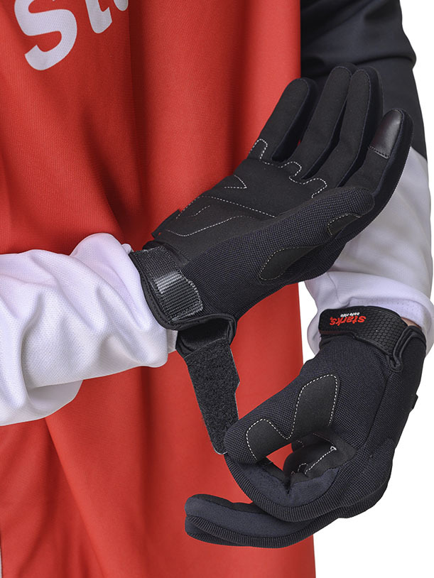 Мотоциклетные перчатки Starks Kepler за счет укороченных манжет с удобным пластиковым ремешком на липучке надежно фиксируются на руке и не стесняют движений. Мягкий внутренний наполнитель обеспечивает надежную защиту уязвимых зон ладони и тыльной стороны кулака, поглощающую удары. На большом пальце предусмотрено ребро жесткости в виде нашивки из плотной эко-кожи, а конец указательного пальца оснащен сенсорным участком.