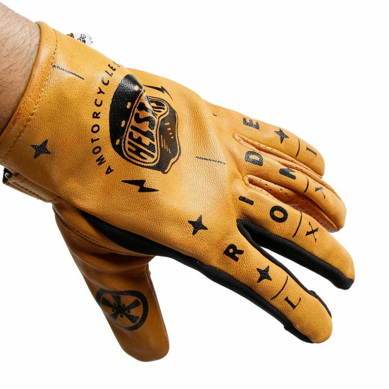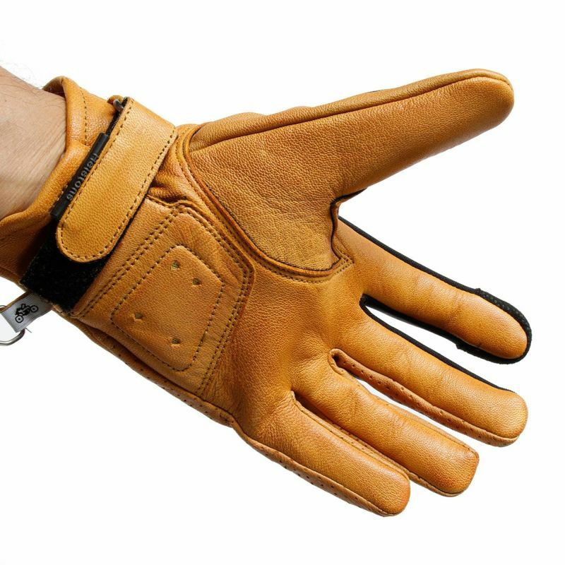 Летние мужские мотоперчатки Helstons Kustom Ete Cuir из толстой кожи-шевро золотистого цвета. На кожу методом термопечати нанесены стилизованные декоративные элементы серии Motorcycle Story, которые содержат отсыл к байкерской субкультуре 70-х годов. Мотоперчатки укороченные, облегченные, на тонкой подкладке из гигроскопичного трикотажа. На пальцах кожа перфорирована для лучшей вентиляции, на указательных пальцах — токопроводящие вставки для работы с гаджетами. Кожа имеет влагоотталкивающую пропитку и легкую тонировку под ретро-стиль.