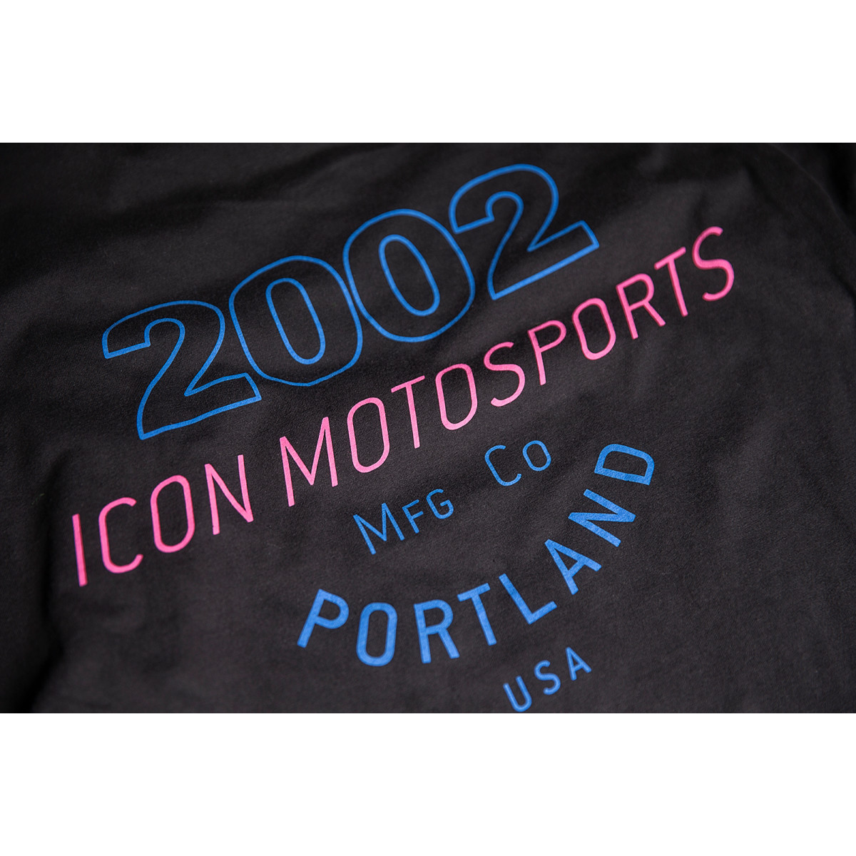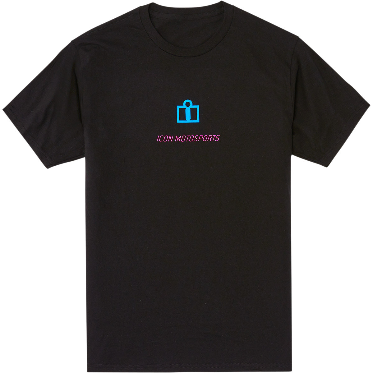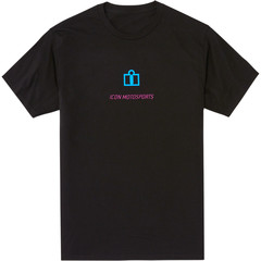 Черная мужская футболка Icon из серии MFG. Все предметы мотоэкипировки в этой серии посвящены созданию мануфактуры Icon Motosport в 2002 году в Портленде – эта надпись в том или ином виде отображена на одежде и аксессуарах. В данном случае крупная голубая надпись расположена на спине футболки, спереди – лаконичный голубой логотип с красным названием бренда.