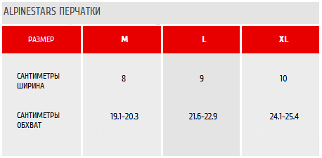Чтобы правильно определить ваш размер мотоперчаток, которые обеспечат максимальный комфорт и защиту, достаточно правильно произвести измерение ширины ладони в оласти костяшек с помощью рулетки или линейки. Полученный результат сопоставте с таблицей. Удачных покупок!