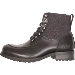 Внешняя отделка выполнена из высокопрочной черной воловьей кожи и шерсти. Внутренняя сторона модели оснащена молнией, позволяющей быстро снимать и надевать обувь. Для правильной и безопасной фиксации мотоботы дополнены шнуровкой. В качестве защиты предусмотрено усиление в зоне мыска и пятки. В области лодыжек присутствуют специальные вставки из гибкого вспененного материала. Внутренняя часть отделана мягкой телячьей кожей и водонепроницаемой дышащей мембраной.