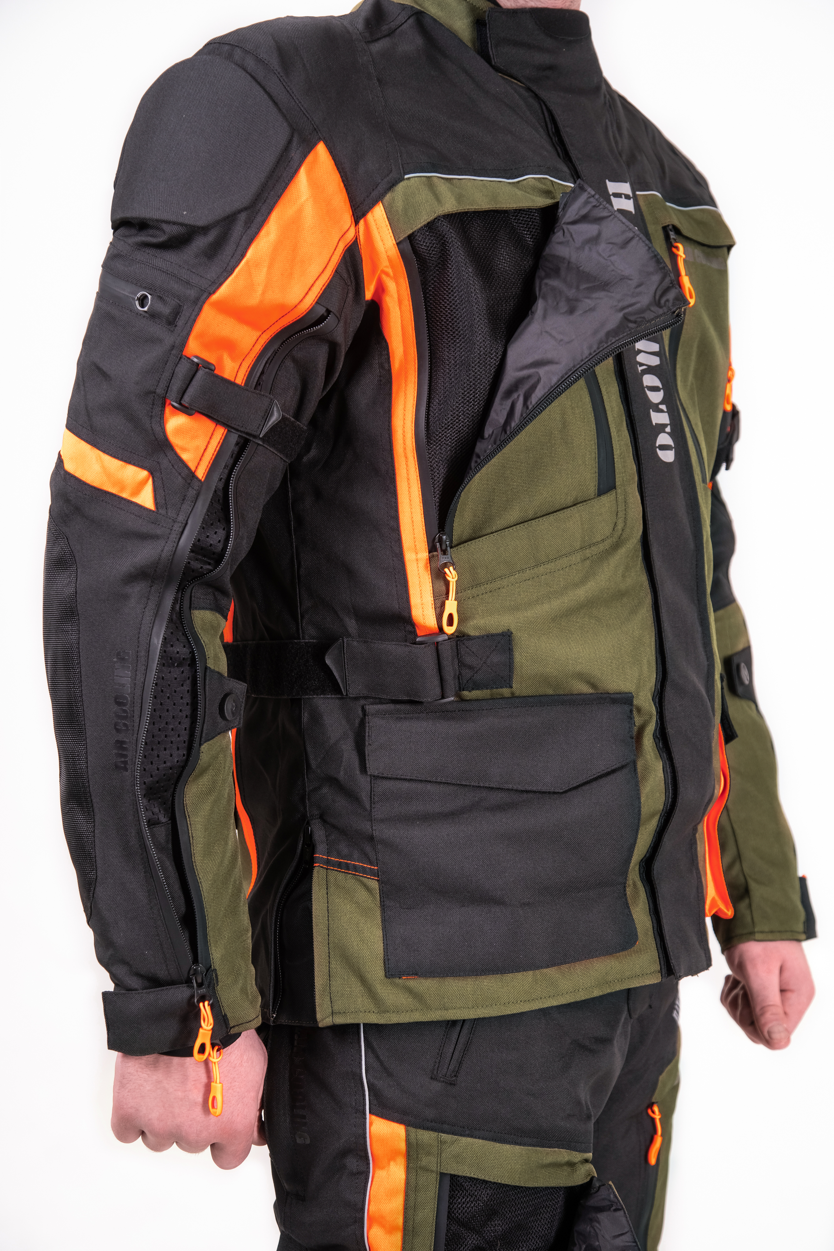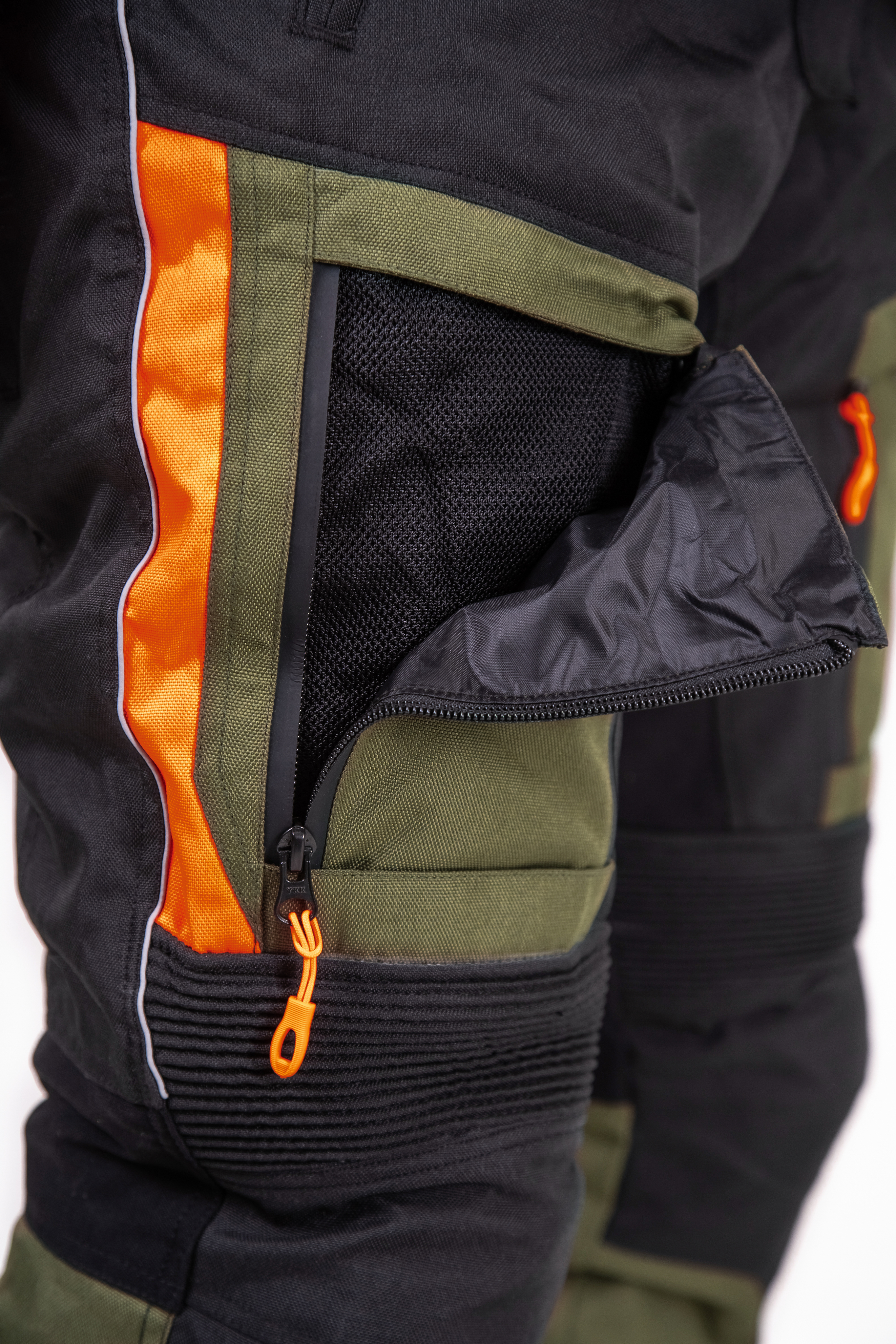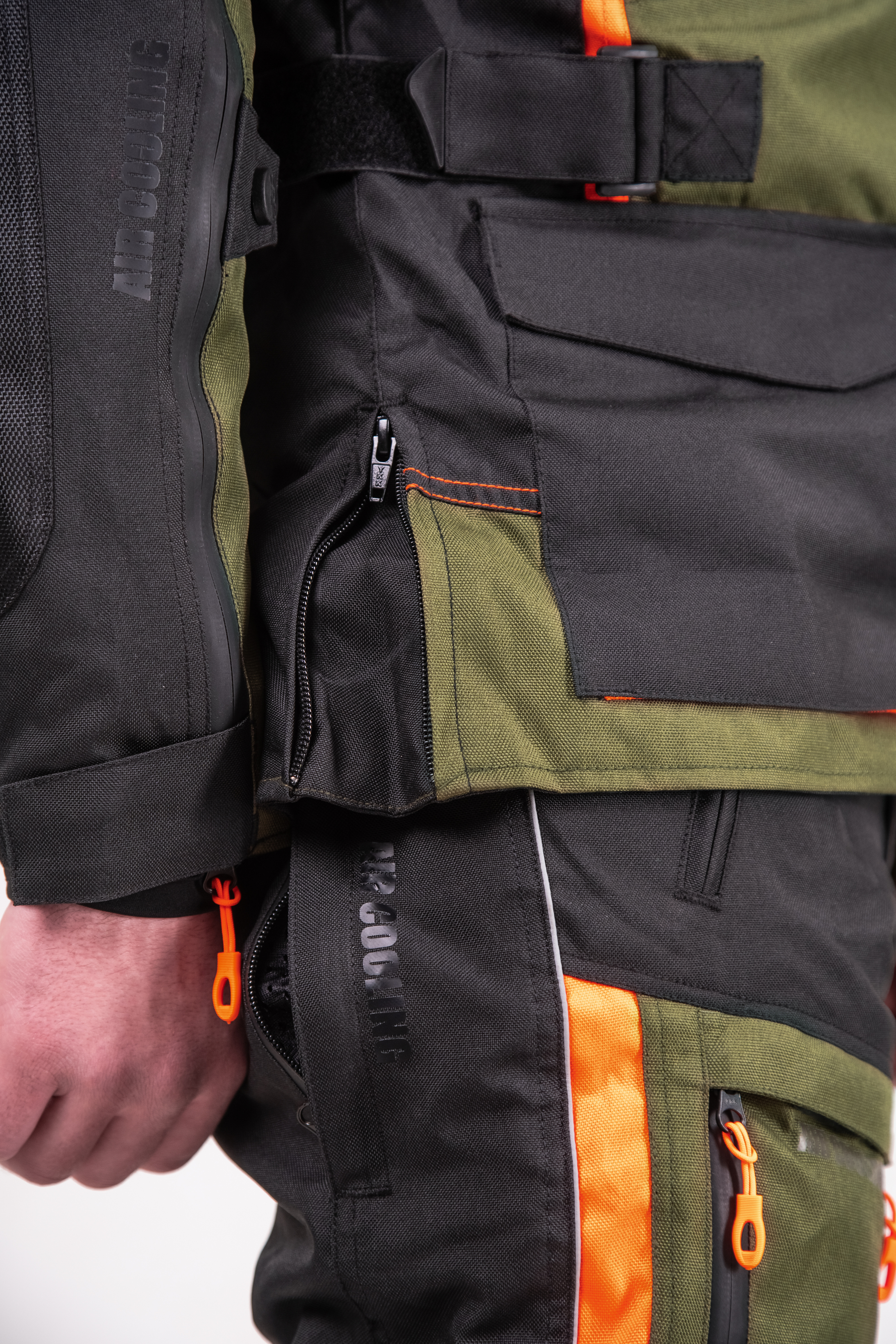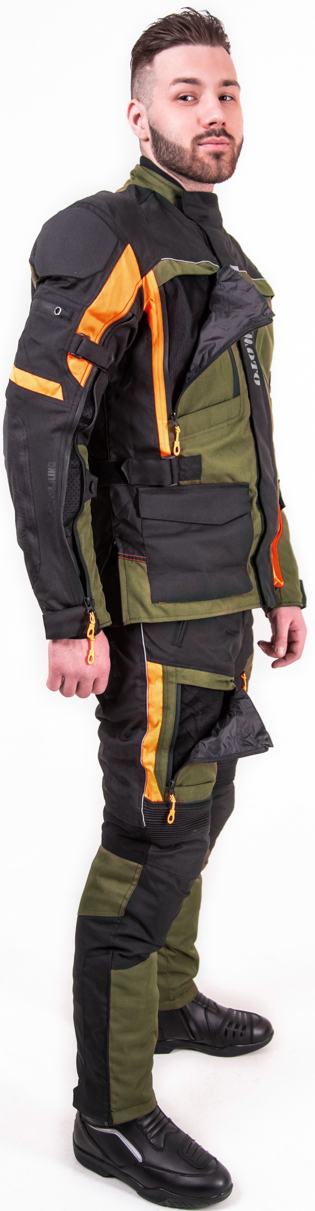 Превосходное цветовое решение — классический черный, дерзкий тёмно-оливковый и светоотражающий оранжевый — не только придает костюму индивидуальность, но и повышает заметность в транспортном потоке, что особенно важно для безопасности. Все молнии оснащены прорезиненной защитой и увеличенными слайдерами, а молния для пристегивания брюк к куртке обеспечивает дополнительную защиту и комфорт.