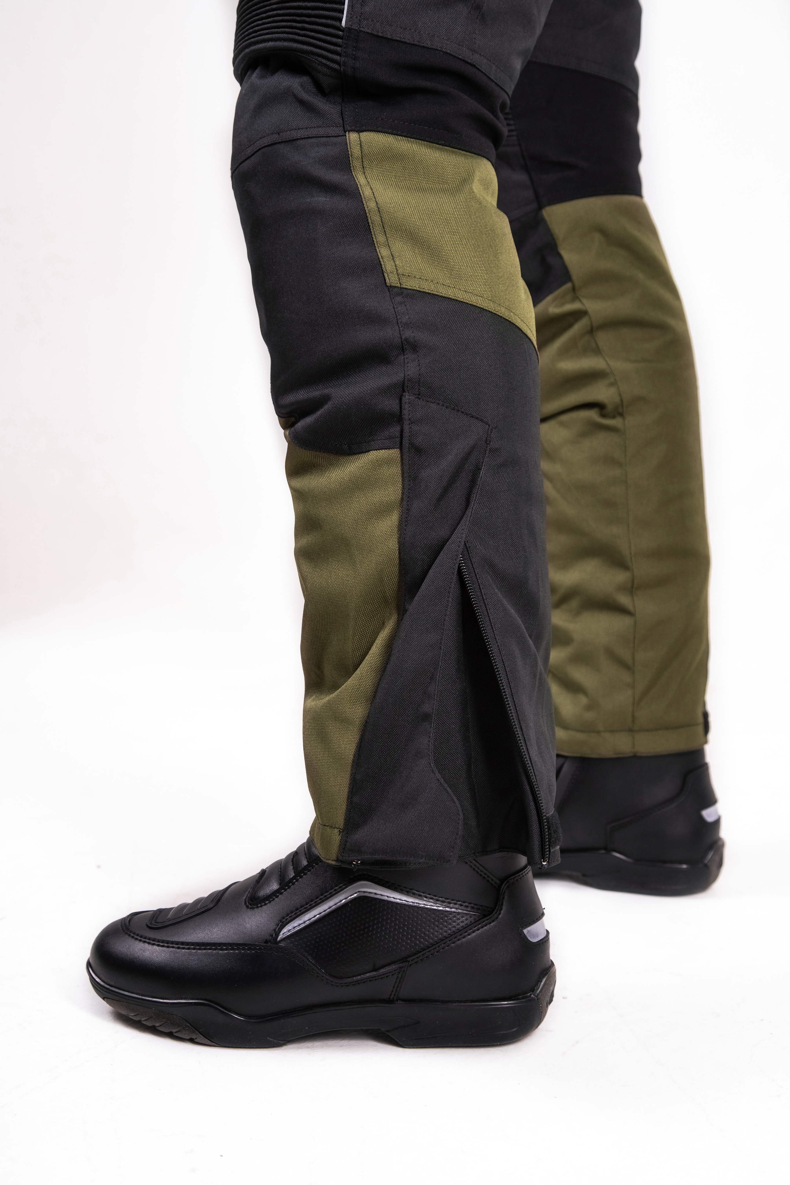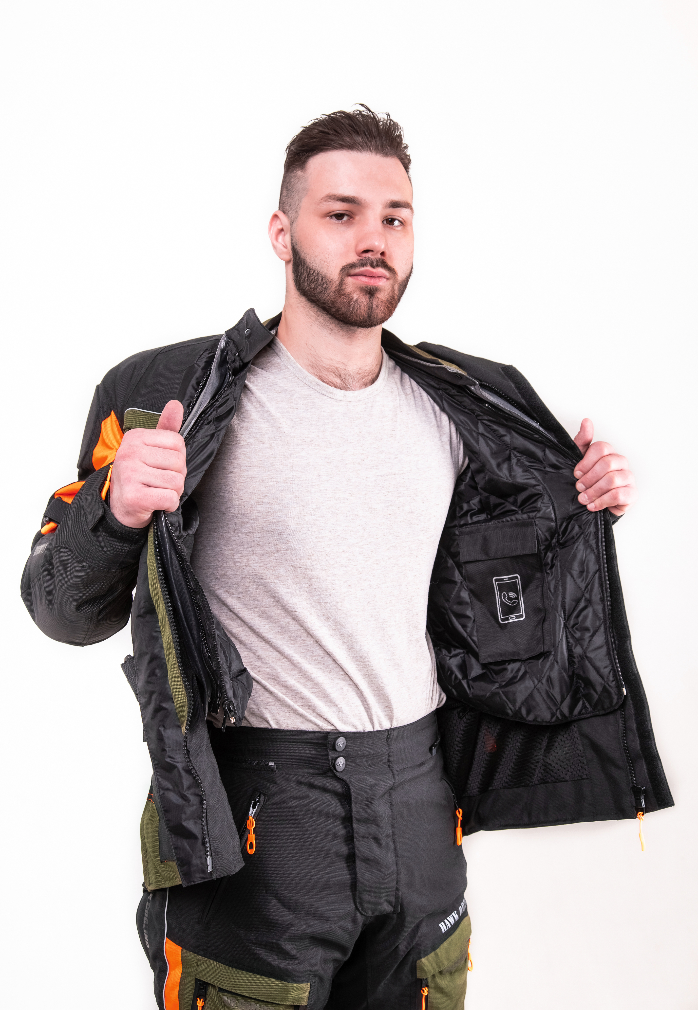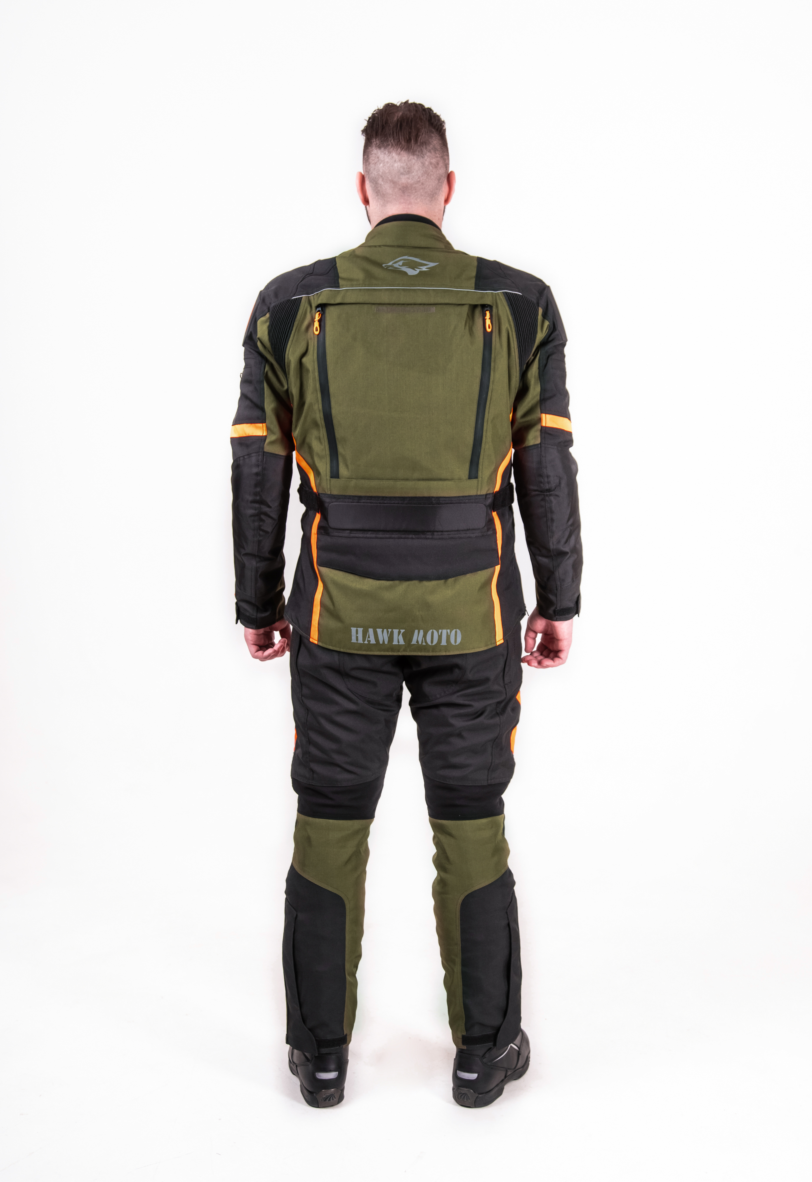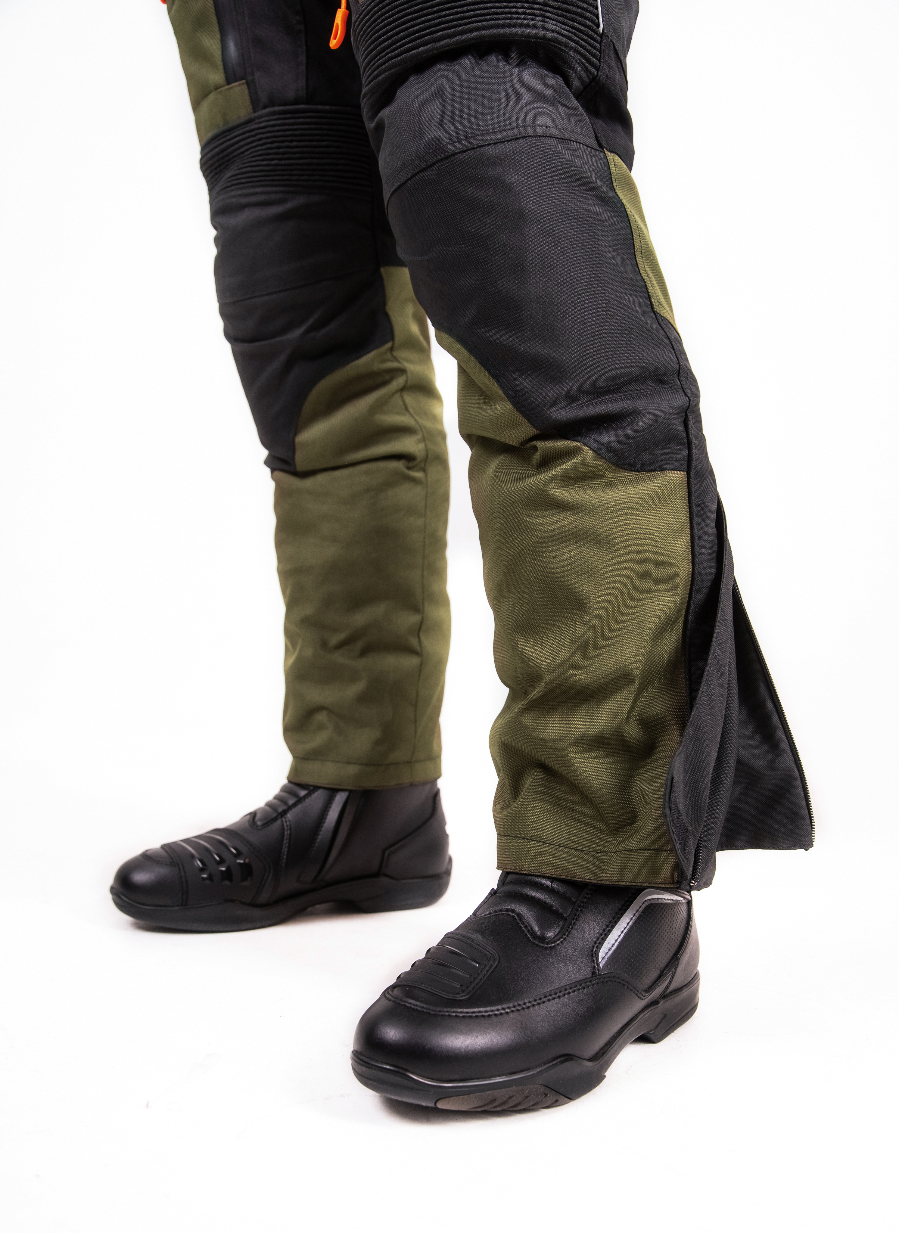 Превосходное цветовое решение — классический черный, дерзкий тёмно-оливковый и светоотражающий оранжевый — не только придает костюму индивидуальность, но и повышает заметность в транспортном потоке, что особенно важно для безопасности. Все молнии оснащены прорезиненной защитой и увеличенными слайдерами, а молния для пристегивания брюк к куртке обеспечивает дополнительную защиту и комфорт.