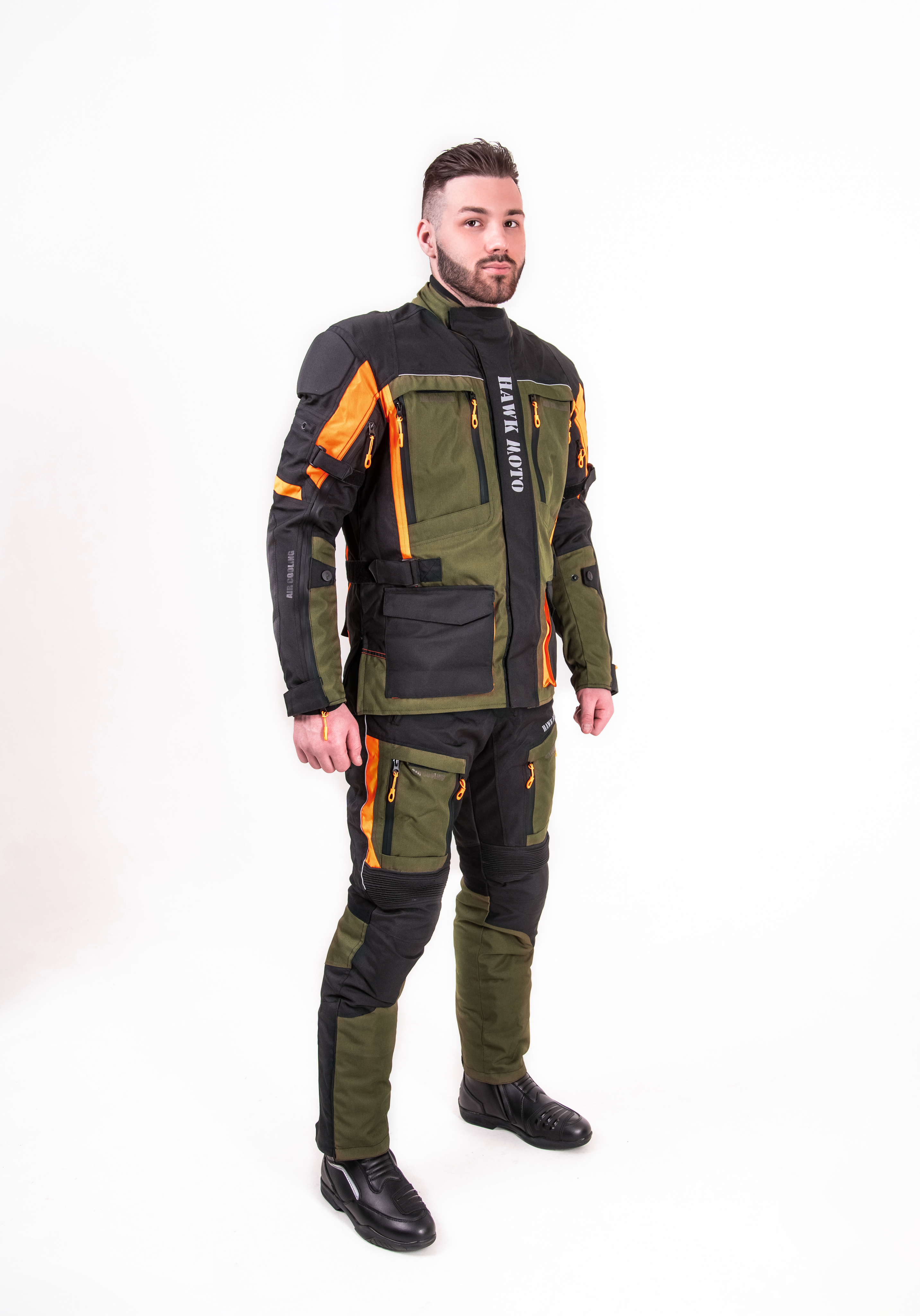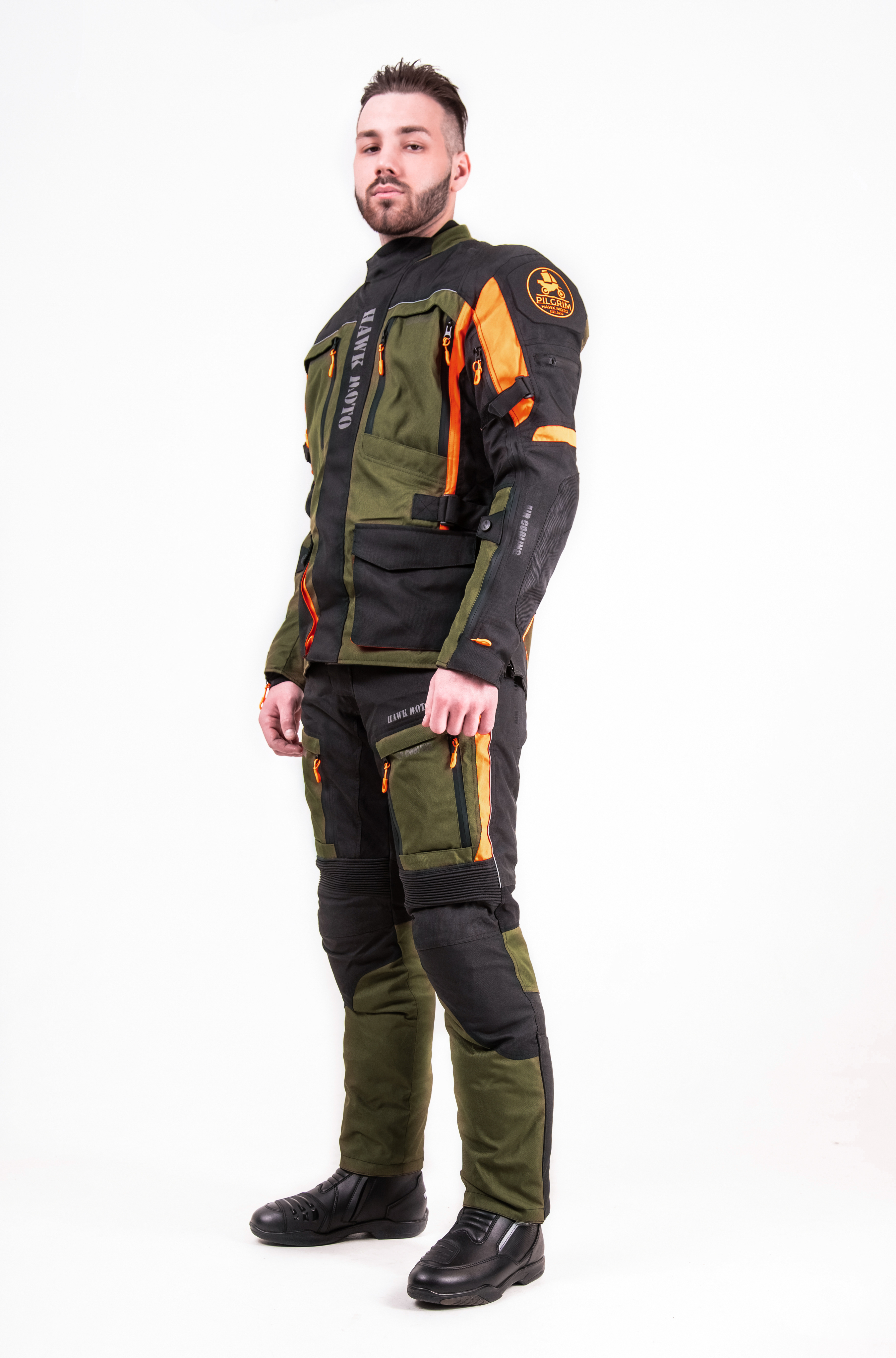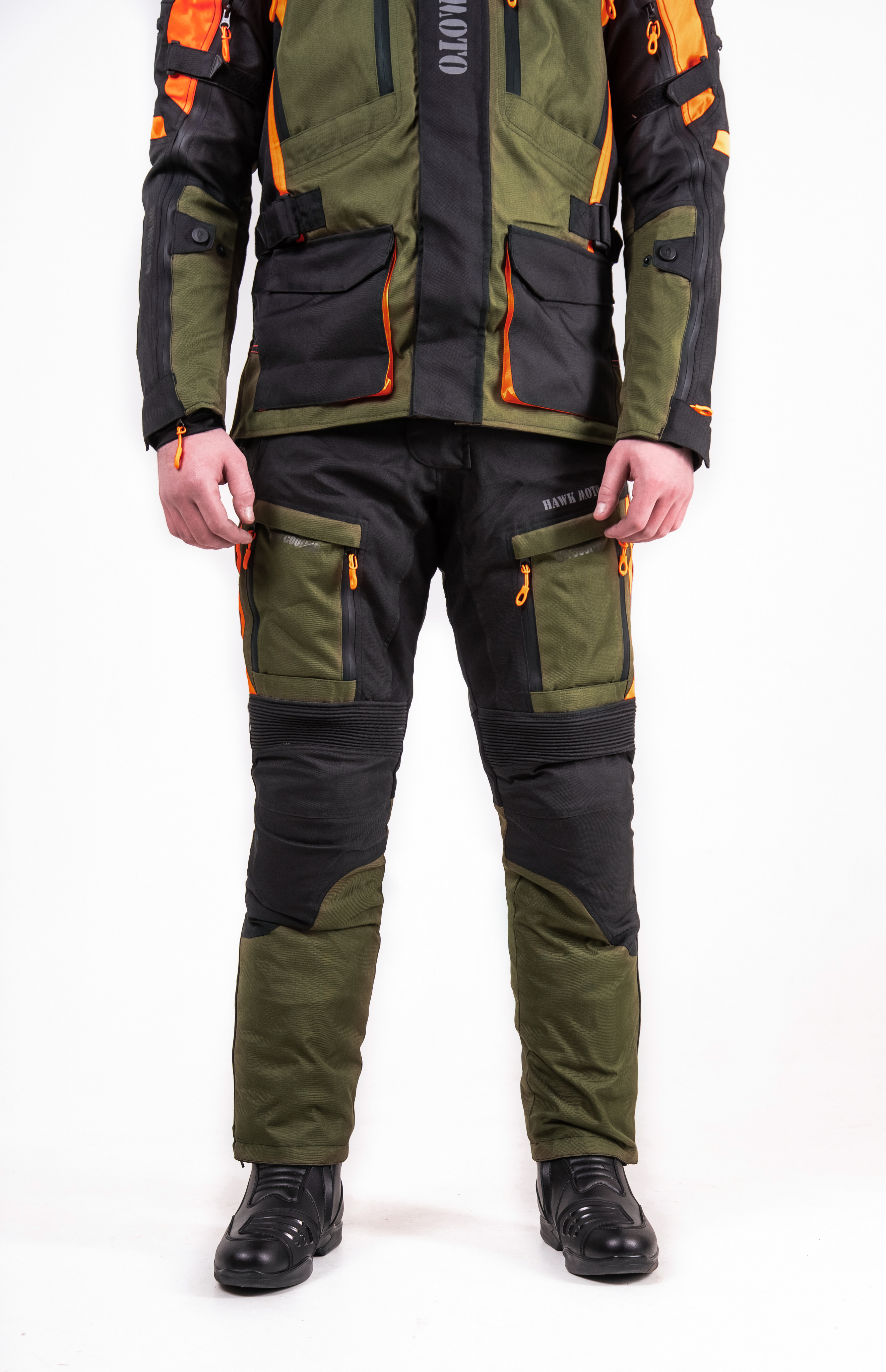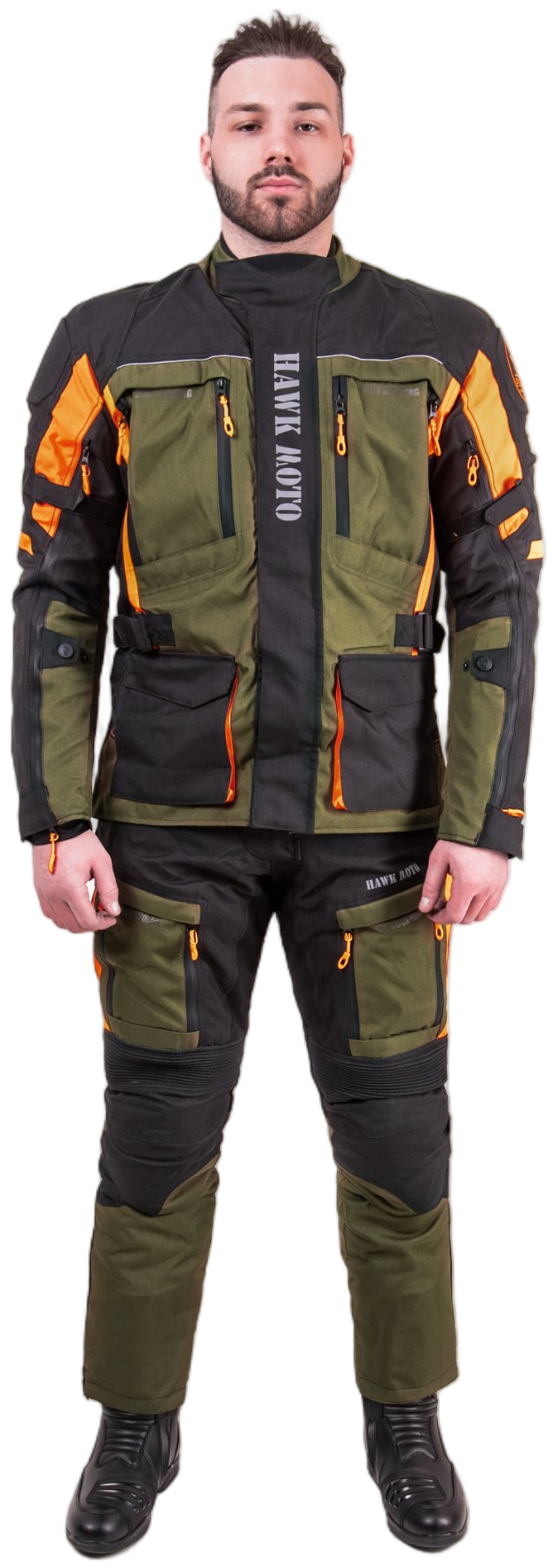 Мотокостюм Hawk moto Pilgrim — это идеальный комплект мотоэкипировки, разработанный специально для мотоциклистов, которые ценят комфорт и безопасность в длительных туристических поездках, независимо от погодных условий. Этот мотокостюм текстильный в стильном черно-зеленом цвете с оранжевыми вставками не только эффективно защищает от дождя, тумана, жары и сильного ветра, но и обеспечивает высокую заметность на дороге.