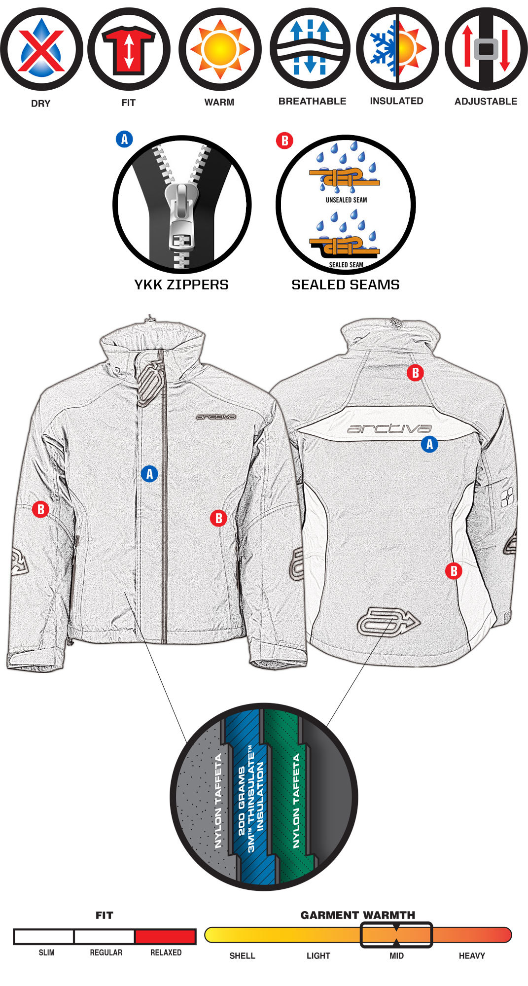 Куртка застегивается на надежную застежку-молнию, спрятанную под утепленной планкой. Высокий воротник-стойка с флисовой подкладкой затягивается на потайную кулиску. Нижний край изделия и манжеты с фиксацией на липкую ленту также регулируются по ширине. Изделие имеет четыре кармана — два закрытых боковых и два внутренних.