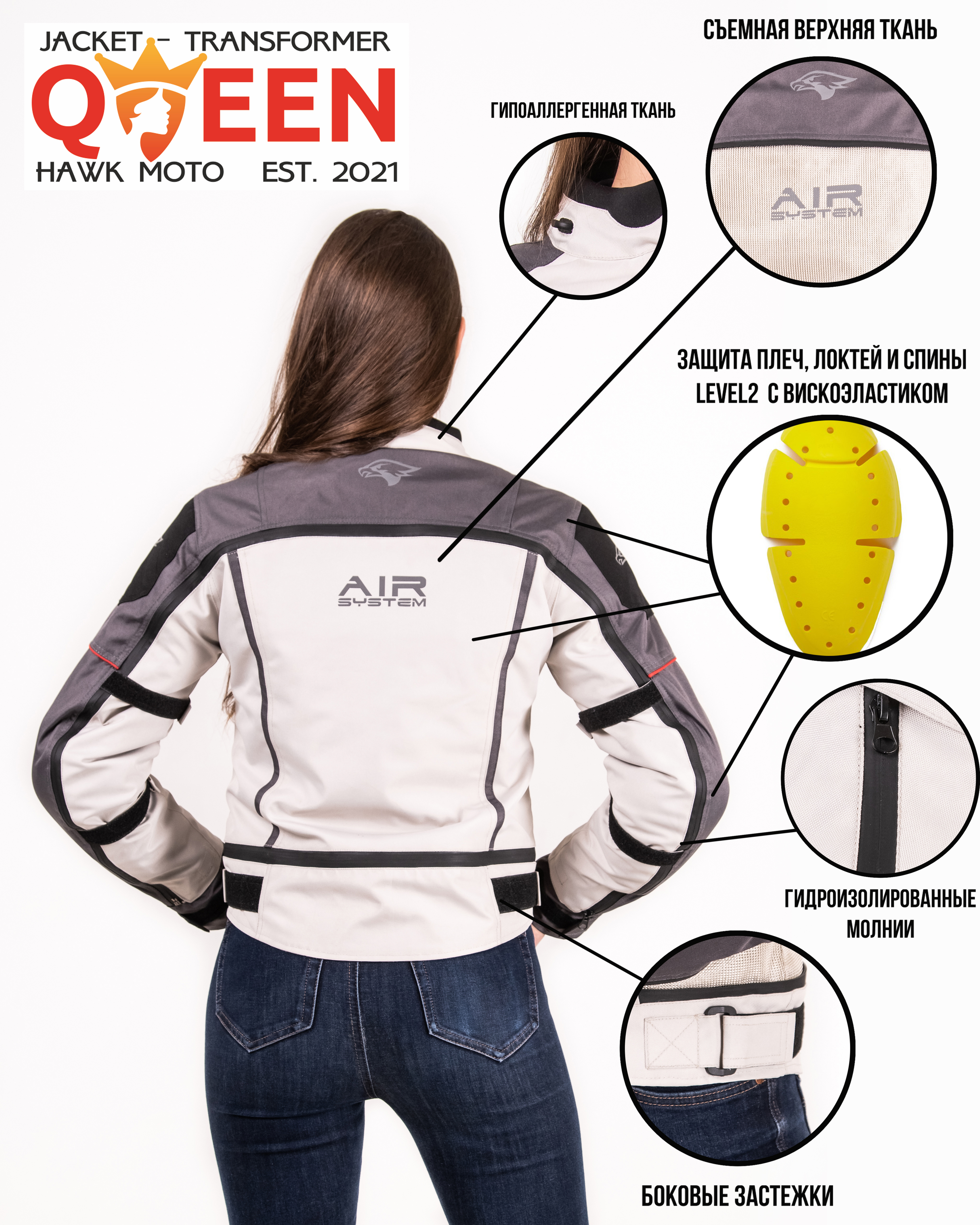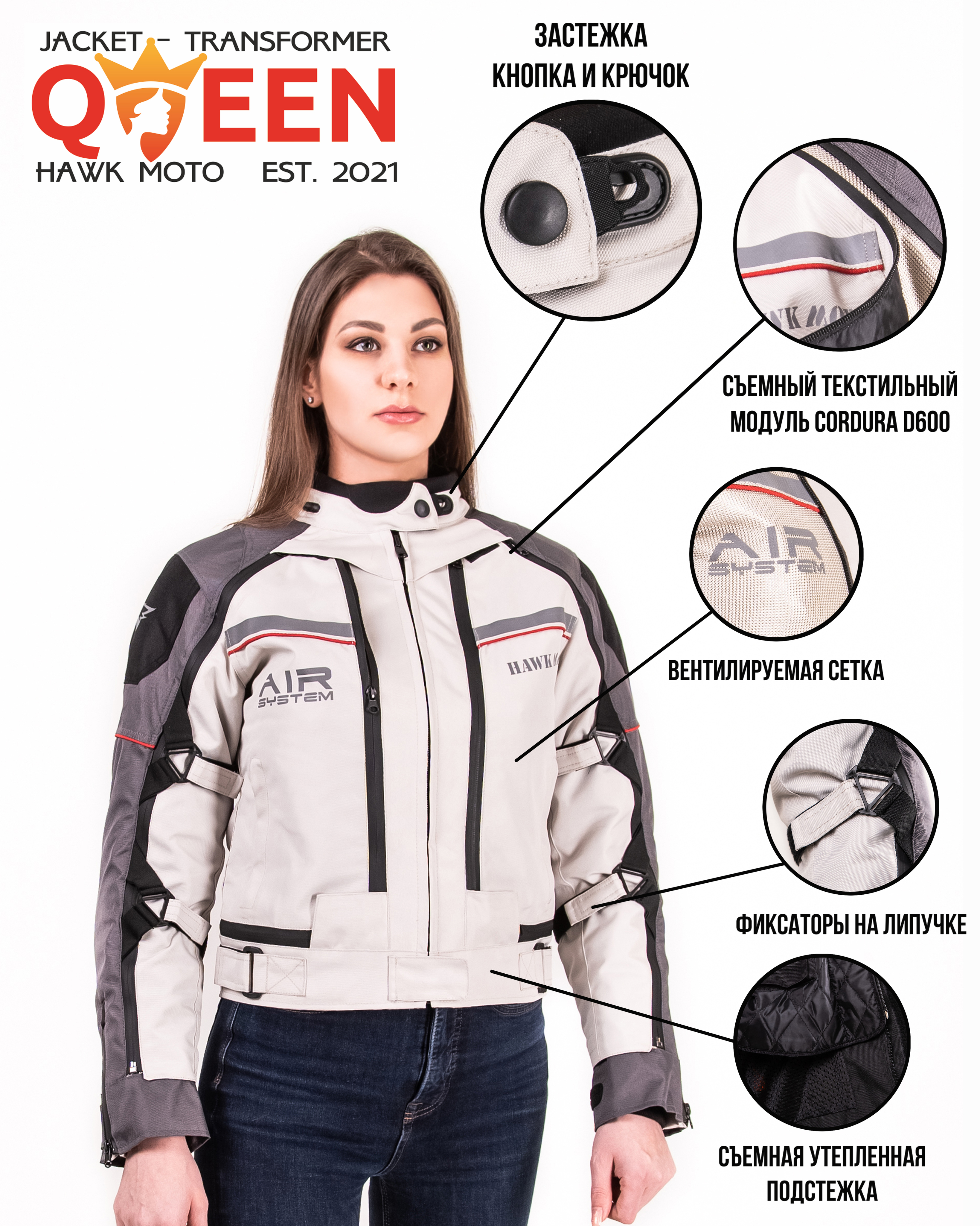 Женская мотокуртка-трансформер Queen от Hawk Moto — это универсальная мотоэкипировка, созданная для максимального комфорта и безопасности в любую погоду. Эта текстильная куртка с защитой станет вашим надежным спутником на протяжении всего мотосезона, от прохладной весны до дождливой осени. Практичность и премиальное исполнение делают ее популярной моделью среди мотоциклисток, что подтверждают многочисленные отзывы.