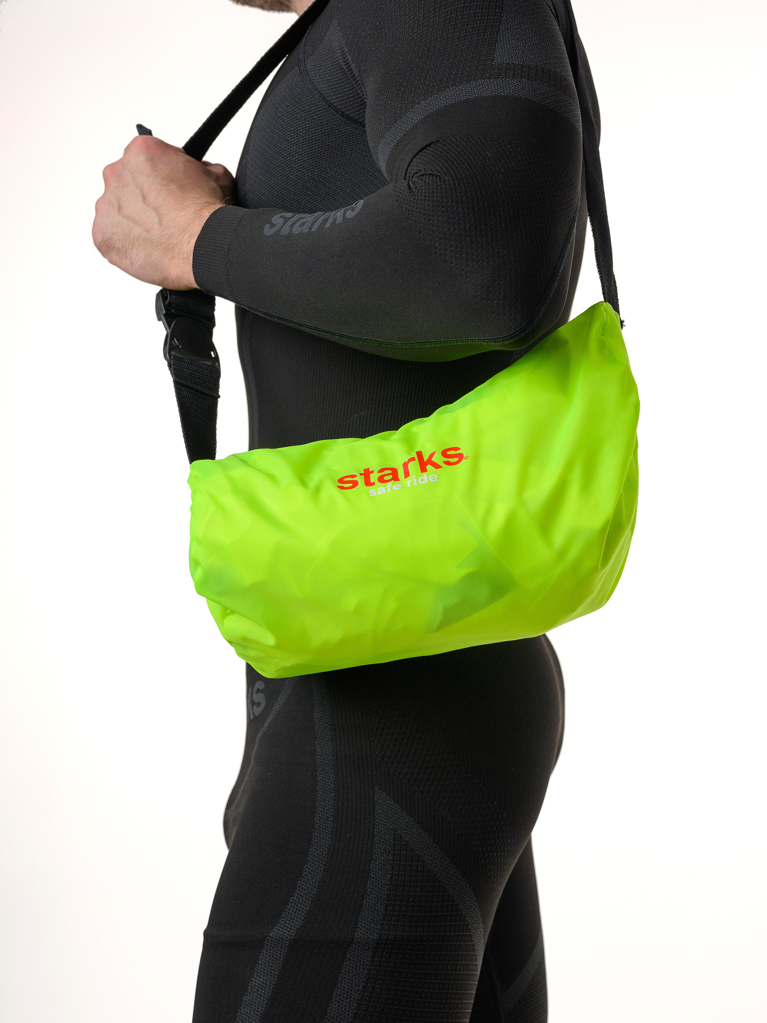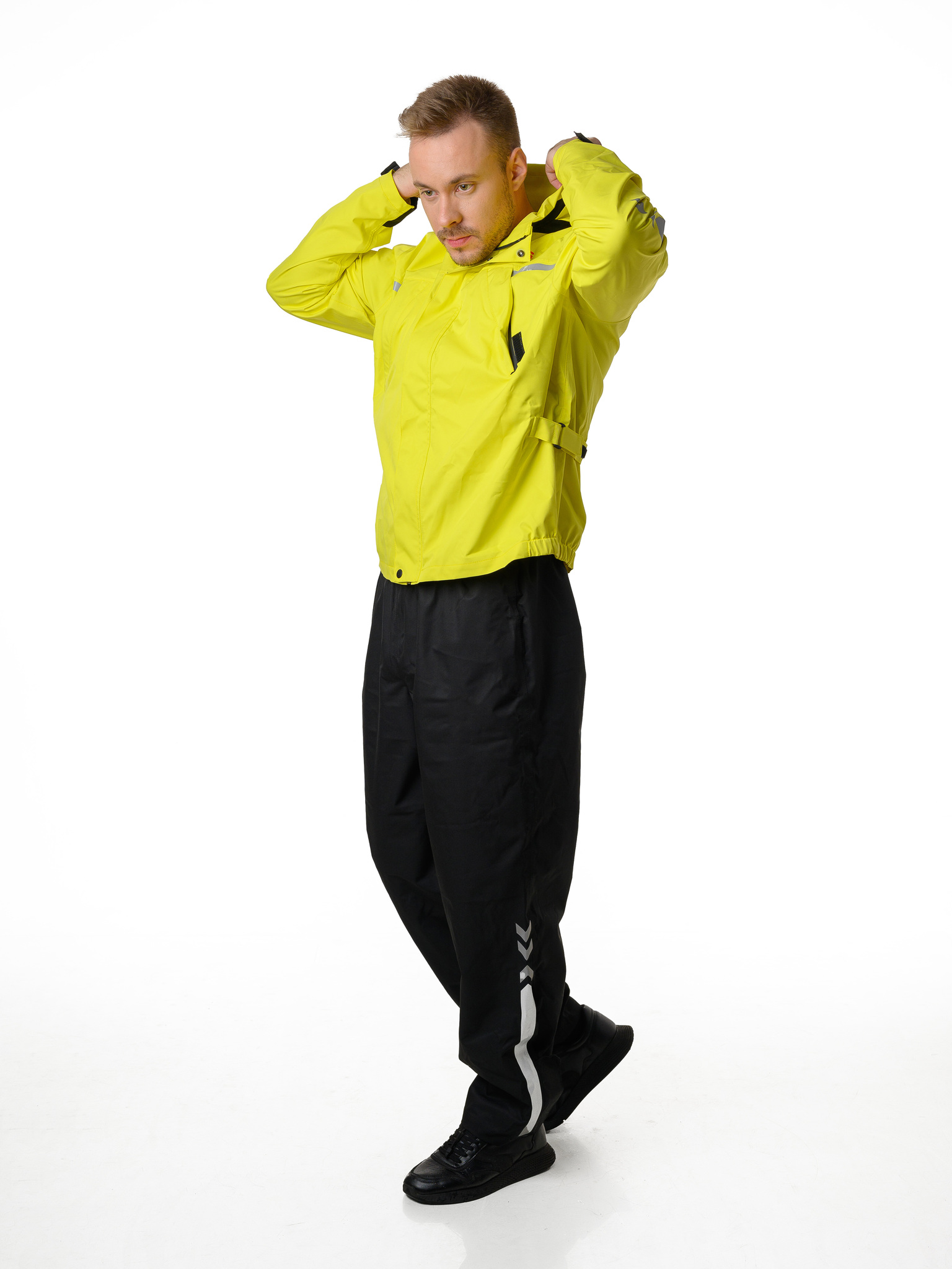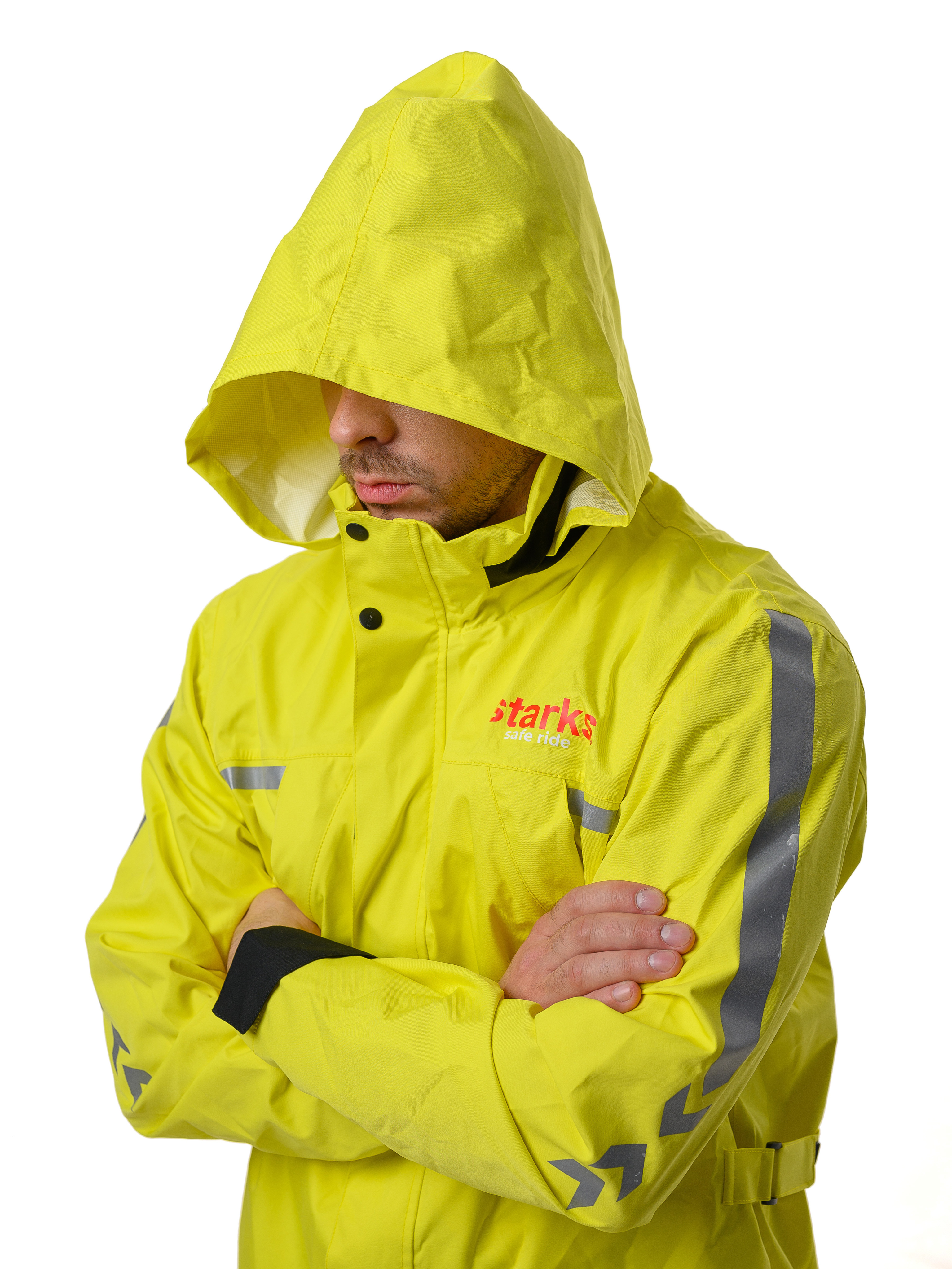 Мужской текстильный мотоциклетный дождевик Starks Rain City в городском стиле с удобными внутренними карманами. Повседневный комплект состоит из куртки с капюшоном и брюк из качественной ветро- и влагозащитной мембранной ткани. Одежда защищает от проливного дождя, мокрого снега и грязи, надевается поверх мотоэкипировки. Желтый сигнальный цвет в сочетании со светоотражающими элементами по всему костюму способствуют повышению пассивной безопасности в темноте и в условиях плохой видимости.