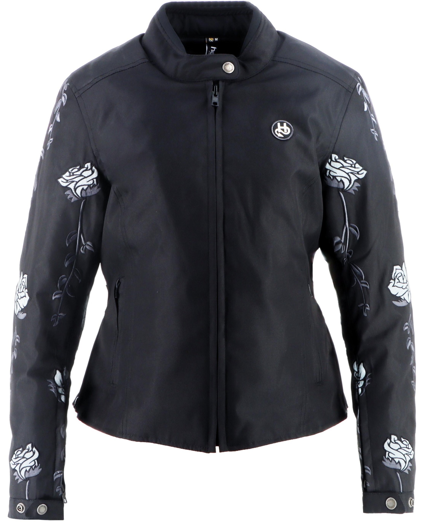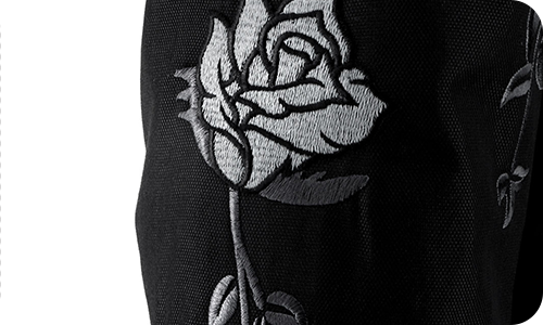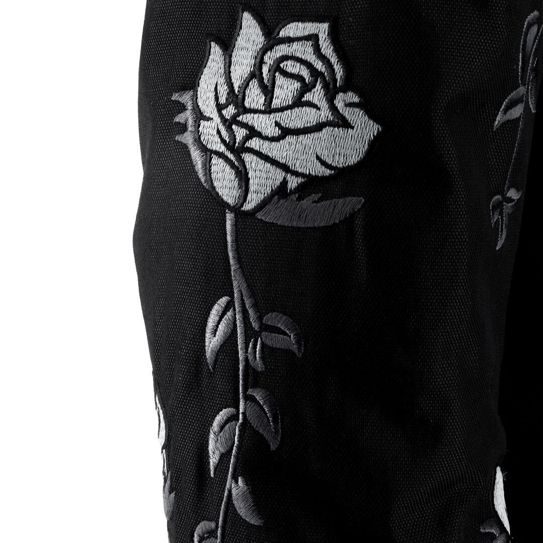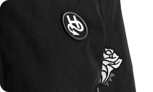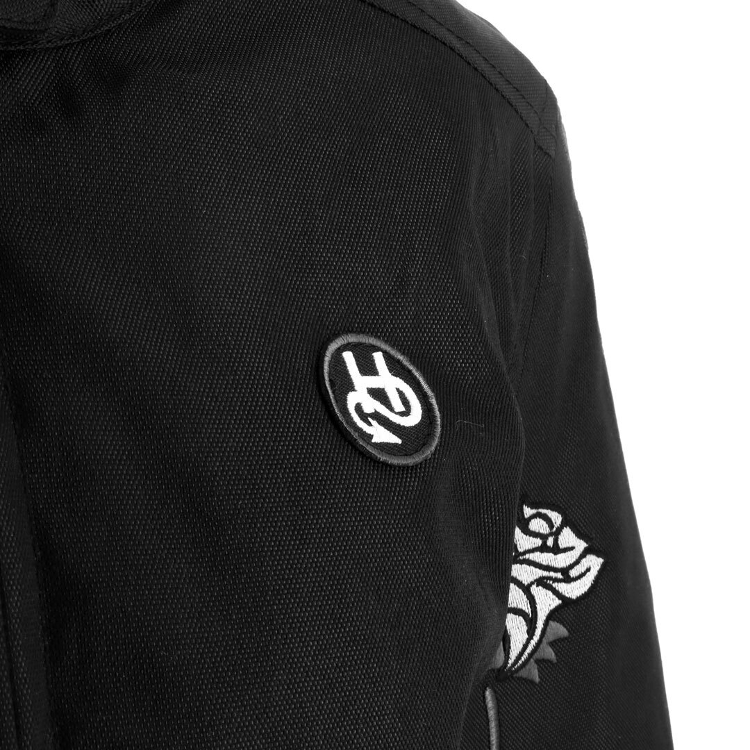 Женская куртка Helstons Rosa из чёрной технической ткани, украшенная вышитыми розами на рукавах, специально разработана для байкеров, ценящих элегантность и комфорт.