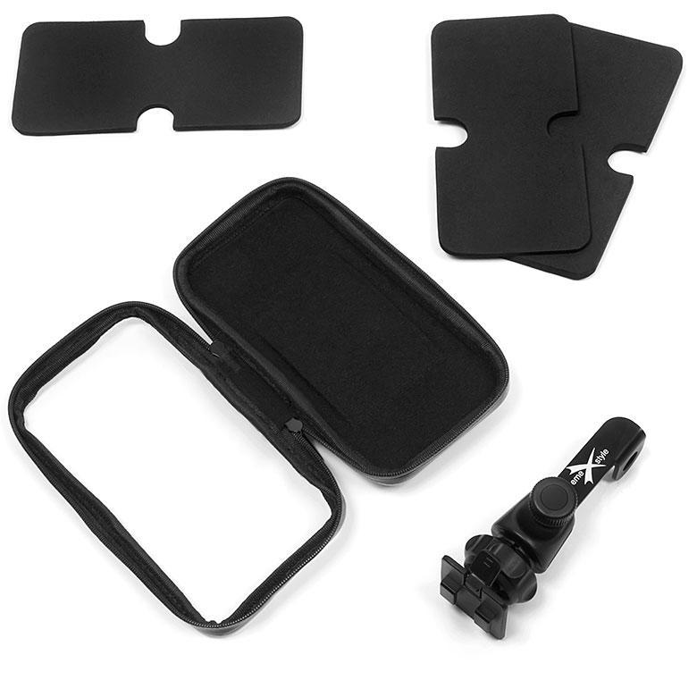 Держатель легко устанавливается на руль байка без использования специальных инструментов. Прорезиненные прокладки внутри аксессуара не позволяют наполнению смещаться по сторонам. В комплект входит короткая штанга для надежной фиксации устройства при скоростном передвижении. Благодаря подвижному механизму чехол способен вращаться на 360 градусов, обеспечивая удобную эксплуатацию.