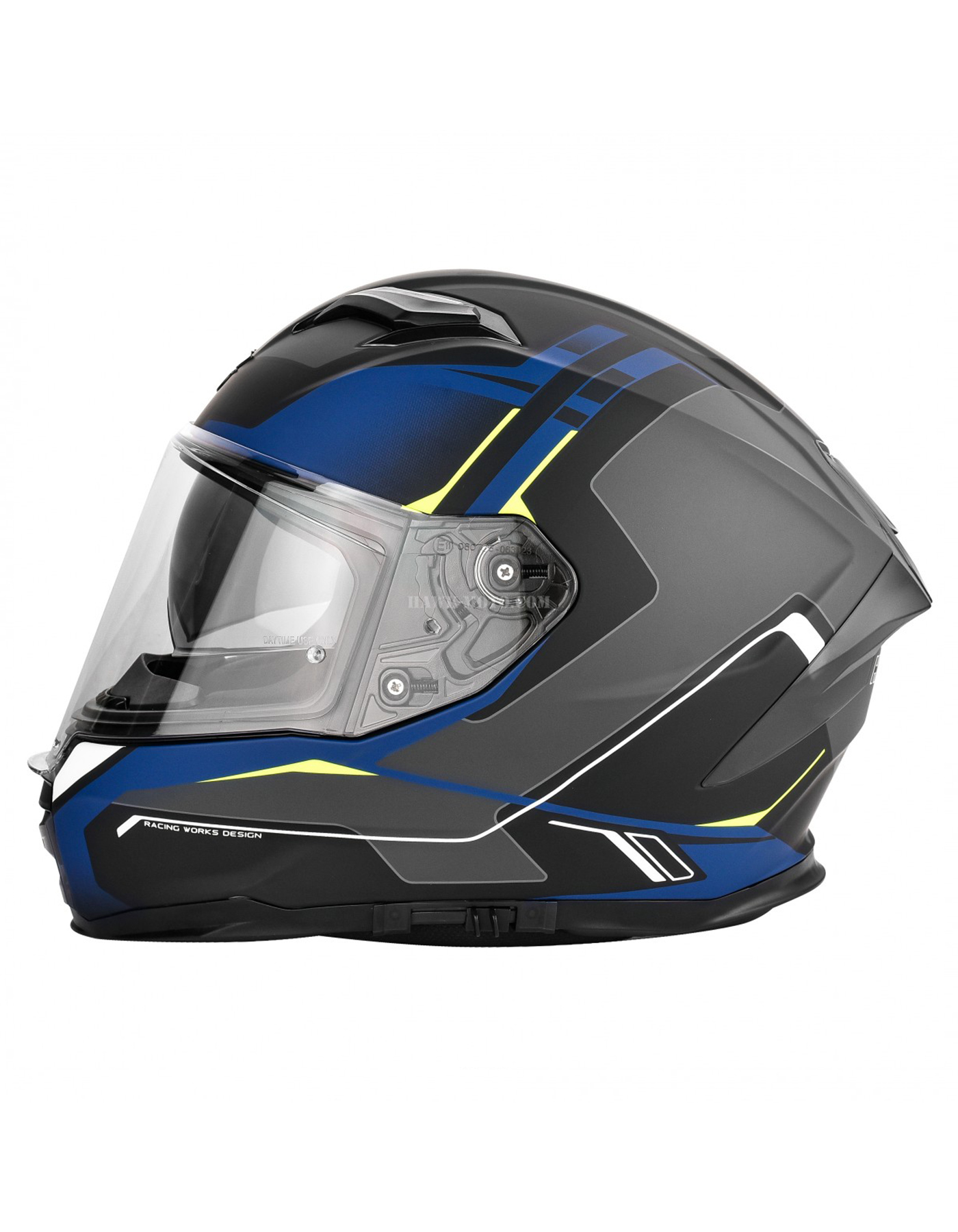 Прочная внешняя оболочка мотошлема изготовлена из прочного, но легкого композитного материала (например, из стекловолокна и органических волокон), что обеспечивает исключительную надежность при падениях и снижает риск повреждений. Обтекаемая форма корпуса минимизирует сопротивление потоку воздуха, а также помогает снизить нагрузку на мышцы шеи во время длительных поездок или гонок.