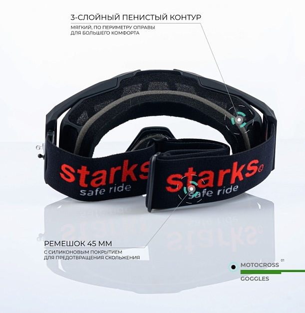 Кроссовые очки STARKS №101 в черной оправе с ударопрочной поликарбонатной линзой, предназначенной для профессионального мотоспорта. Наиболее популярная модель в линейке Starks с максимальной эффективностью в своей ценовой категории. ANTI-FOGGING и защита от царапин нанесены в заводских условиях. Линза крепится в 9 точках, имеет 90-процентную прозрачность и обеспечивает максимальную видимость и самый широкий обзор среди всех очков производителя.