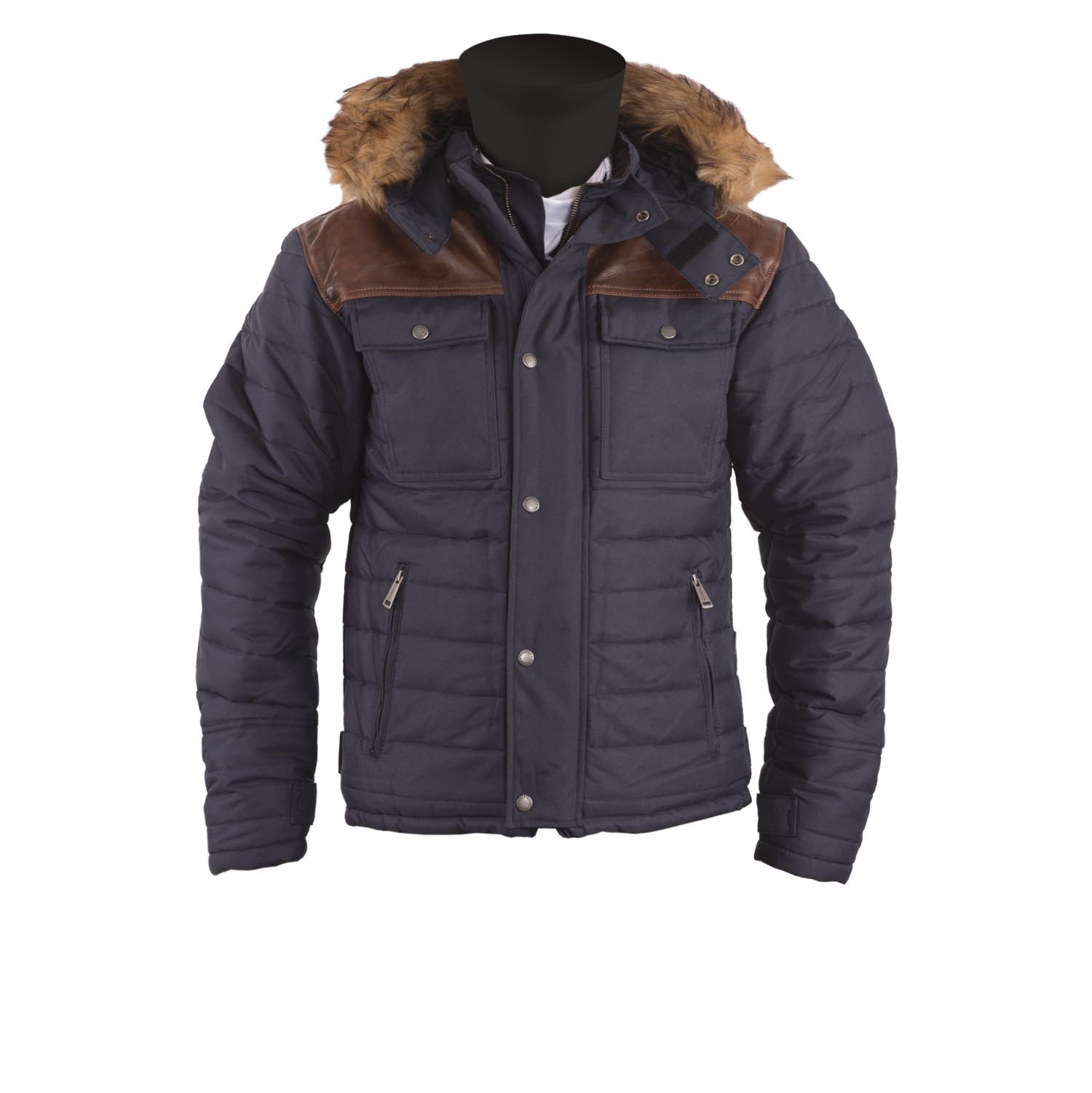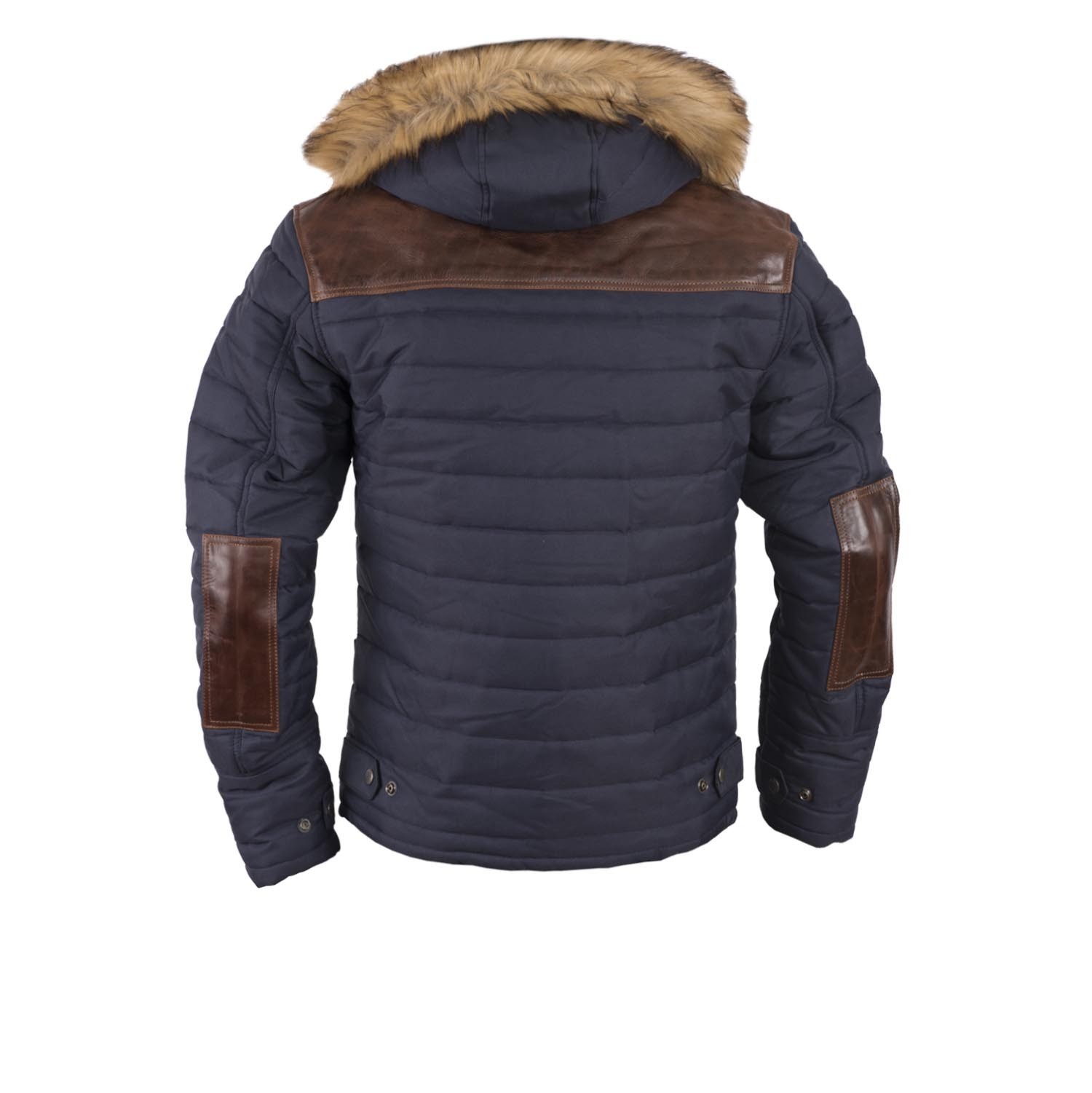 Капюшон с меховой оторочкой легко отстегивается. Мягкий воротник подходит под шлем. Съемные протекторы из поликарбоната защищают спину, локти и плечи от ударов или других повреждений. Коричневая телячья кожа на плечах и локтях красиво контрастирует с синей тканью. Образ дополняют четыре наружных кармана на кнопках и змейках, а также горизонтальная прострочка.
