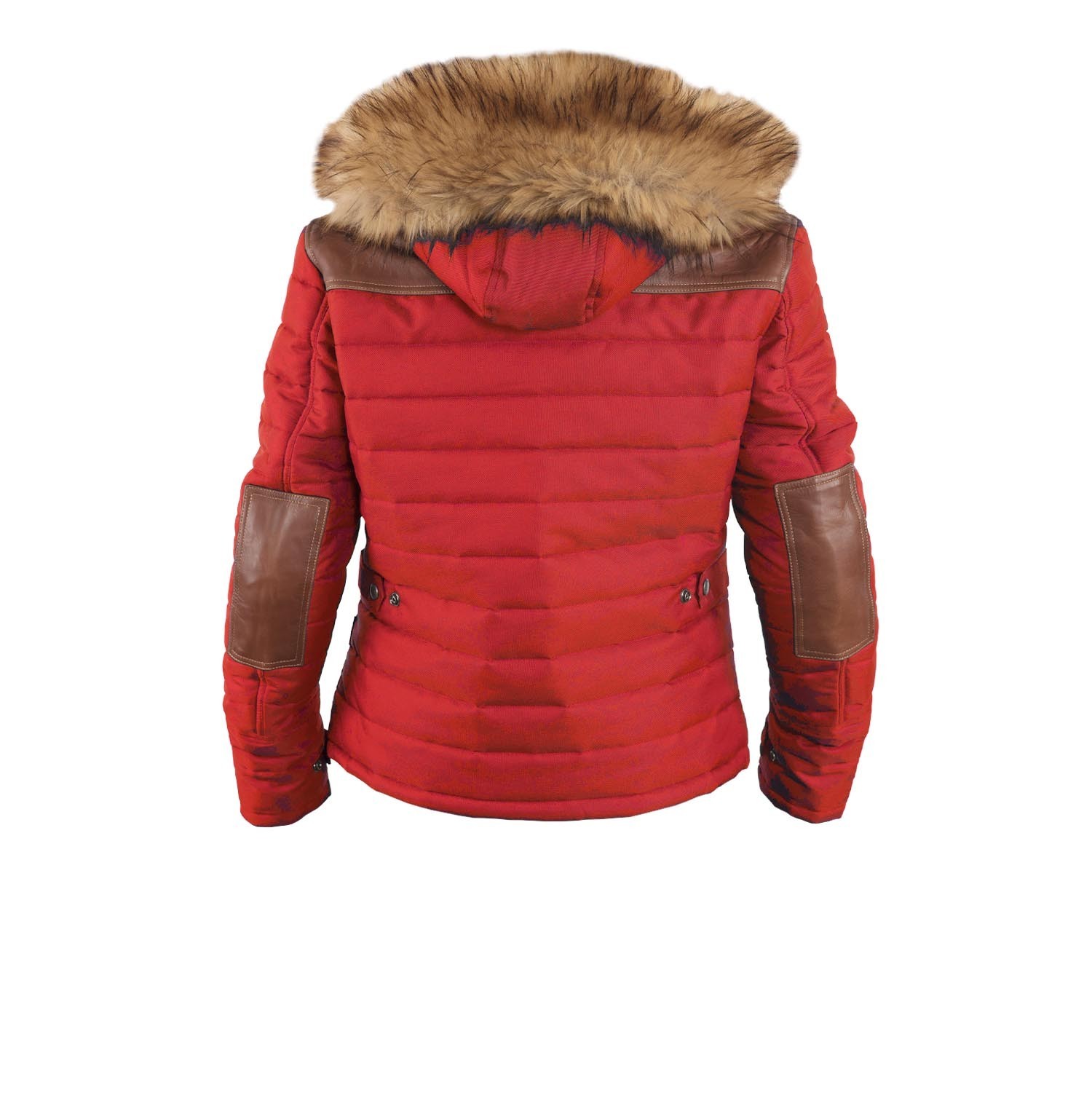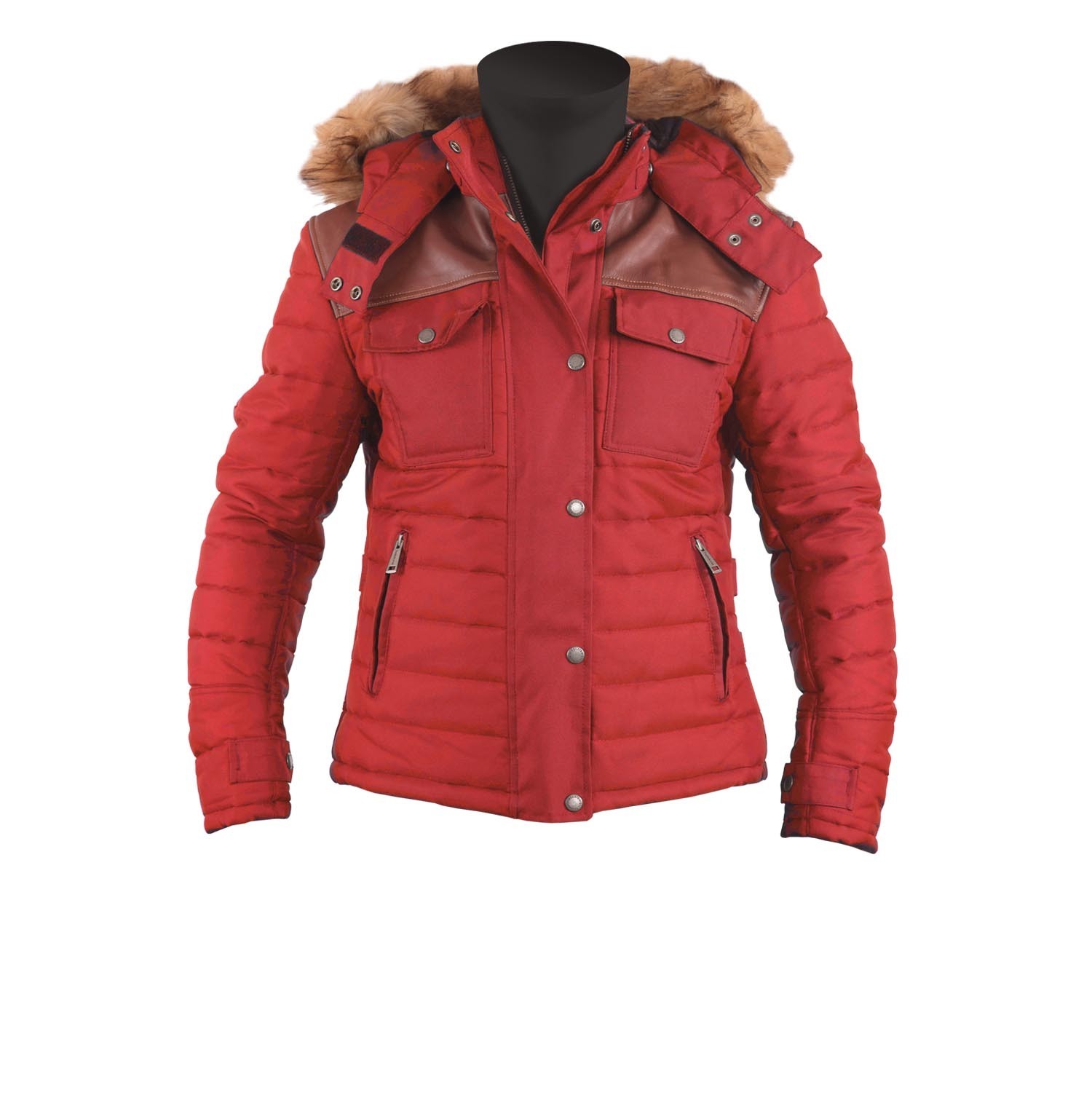 Куртка Helstons Stuff для женщин изготовлена из красной технической ткани с вставками из светло-коричневой коровьей кожи. Фиксированная подкладка (корпус/рукава) имеет два кармана на молнии. Куртка имеет регулируемые манжеты и боковые застежки, а также четыре внешних кармана. В комплект входит съемный капюшон и водонепроницаемая мембрана, а также съемные защитные элементы (плечи, локти и спина) с сертификацией CE.