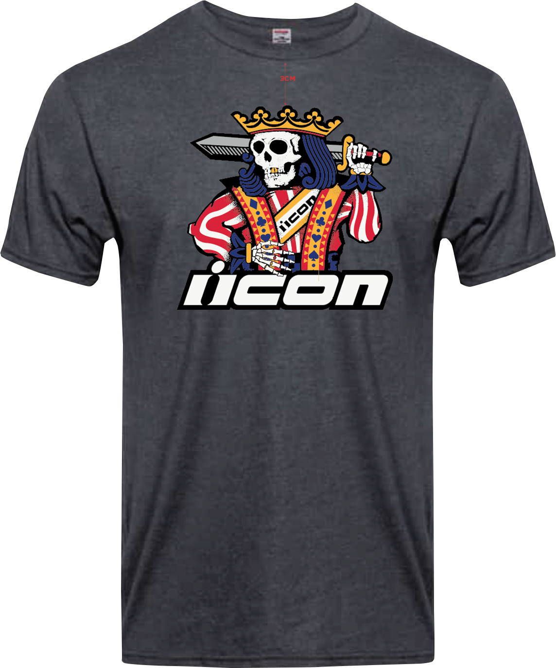Мотофутболка Icon Suicide King T-Shirt серого цвета наверняка придется по душе настоящим байкерам, проникшимся философией бренда Айкон. Яркая термографическая трафаретная печать на груди в готическом арт-стиле пафосно выделяется на темно-сером фоне. Скелет короля-самоубийцы на ней великолепен в своей красной мантии с логотипом бренда, с синими кудрявыми локонами и мечом, рассекающим череп. Эта модель – точно нечто большее, чем просто футболка. Это важный элемент образа.