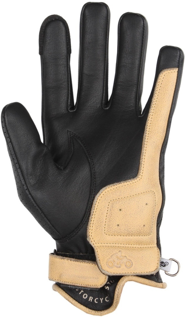 Женские кожаные летние мотоперчатки Helstons Sunshine Air Cuir из черной перфорированной кожи-шевро с отделкой бежевого цвета. Отличаются элегантным дизайном и комфортной посадкой. На тыльной стороне имеют гофрированную вставку, на раструб термопечатью нанесен логотип производителя.