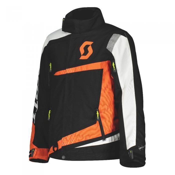 Детская куртка TeamR бренда Scott сконструирована специально для юных любителей снегоходов. Модель привлекает внимание оригинальным кроем, спортивным дизайном и дерзким сочетанием белого, черного и оранжевого цветов. К прочной оболочке крепится двухслойная мембрана DRYOsphere. Она прекрасно дышит, обеспечивая подрастающему райдеру сухость и комфорт, но в то же время защищает от дождя и холода.