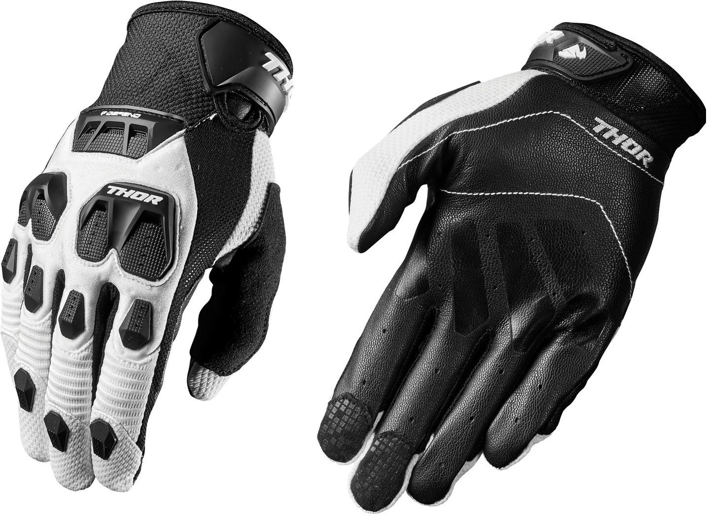 Мотоперчатки Thor S7 Defend сшиты из прочного черно-белого текстиля и снабжены разнообразными защитными вставками из термопластика. Накладка на ладонь выполнена из двухслойной полиэфирной ткани Clarino, которая не дает рукам потеть и обеспечивает идеальное сцепление с рычагами управления.