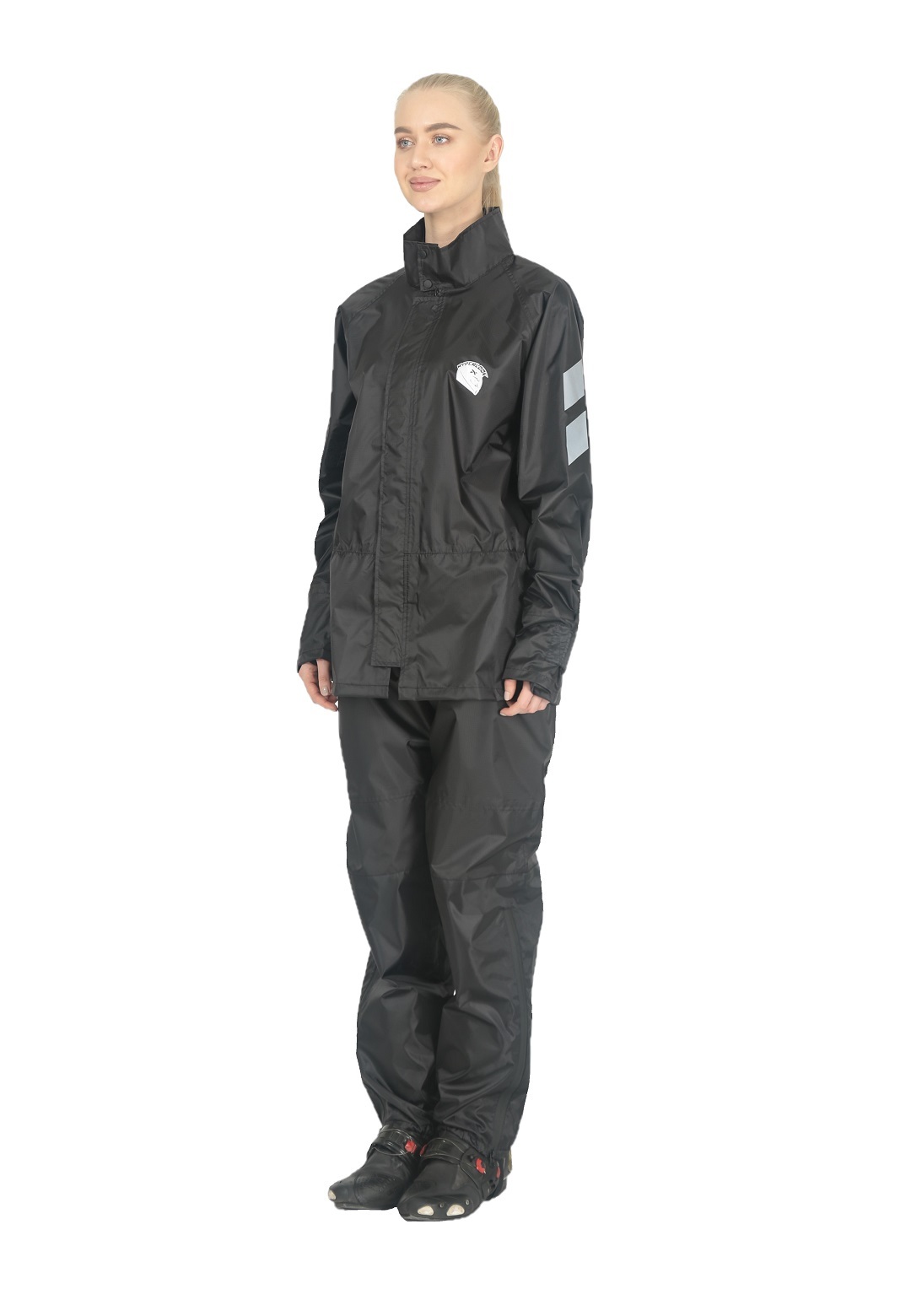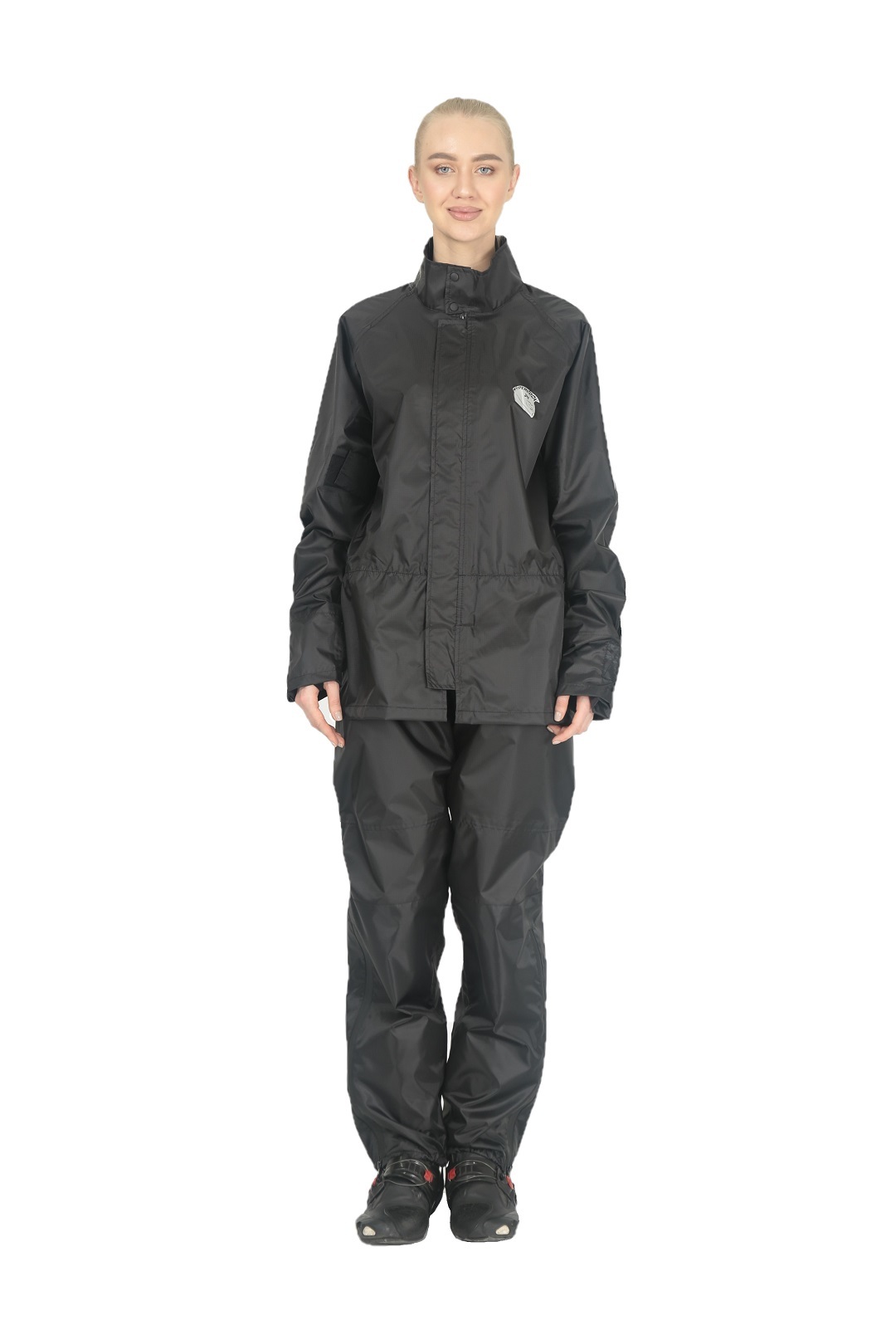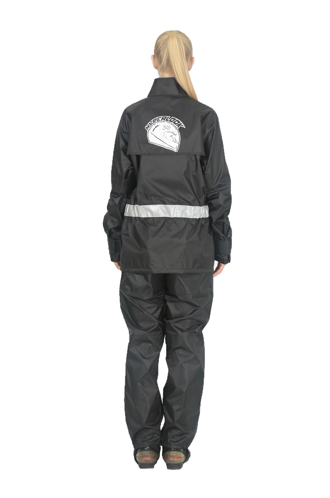Черный раздельный дождевик Hyperlook Titan — практичное и элегантное решение для преданной поклонницы мотоспорта, которая не желает расставаться со своим увлечением даже в дождливые дни. Водозащитный комплект состоит из куртки с регулируемыми утяжками на рукавах и брюк с резинками для ботинок. Оба изделия выполнены из тонкой, но прочной ПВХ-ткани, все швы проклеены герметичной лентой.