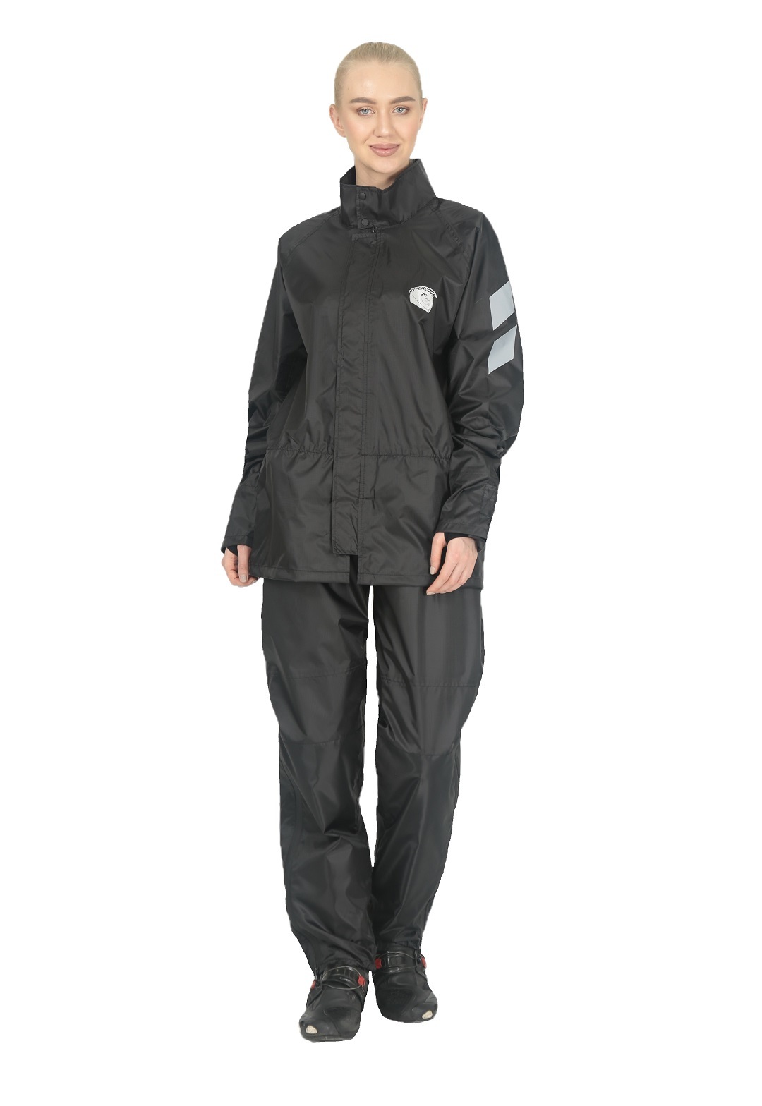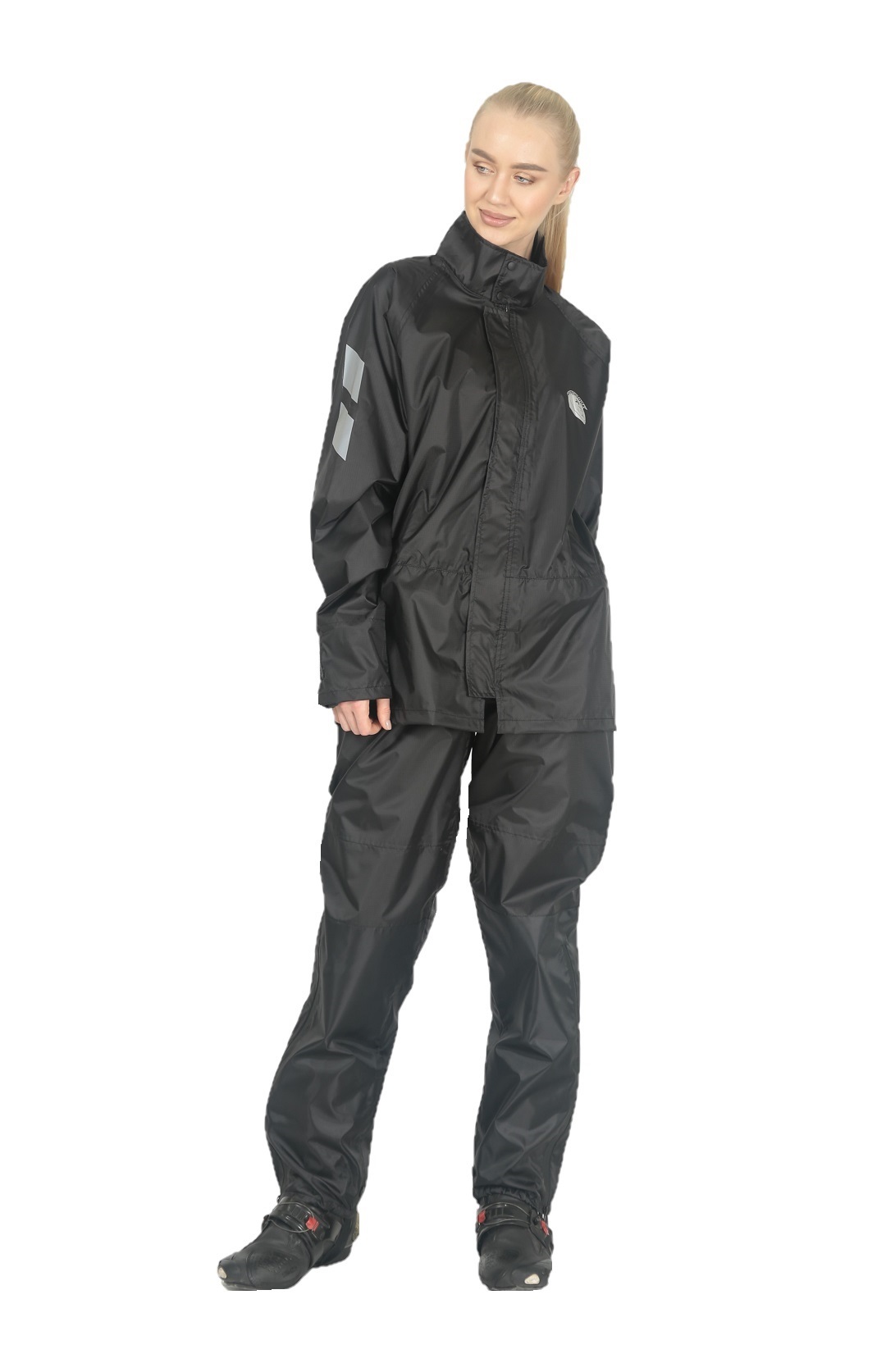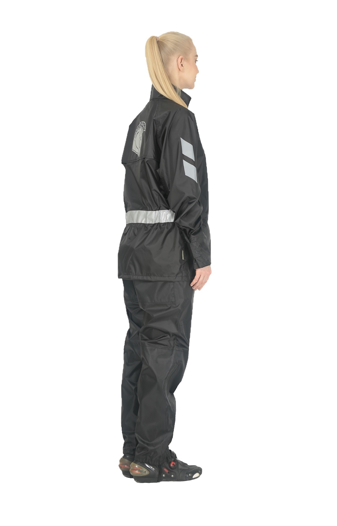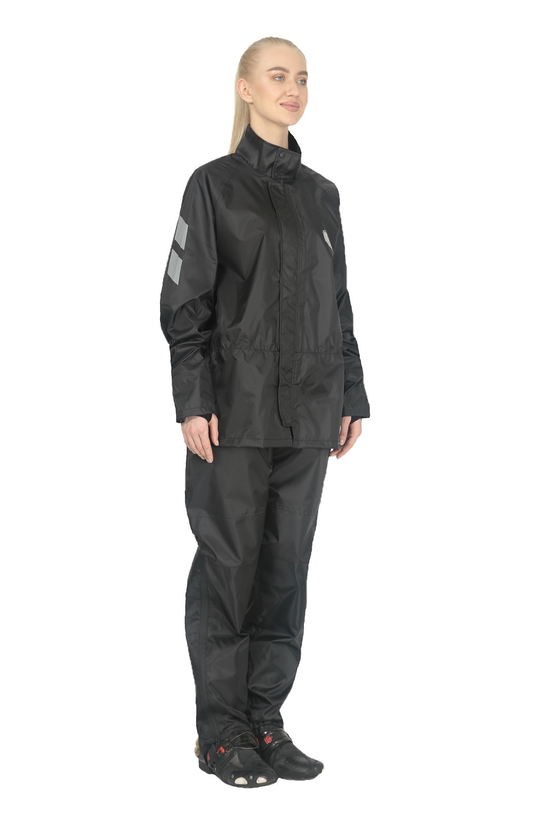 Черный раздельный дождевик Hyperlook Titan — практичное и элегантное решение для преданной поклонницы мотоспорта, которая не желает расставаться со своим увлечением даже в дождливые дни. Водозащитный комплект состоит из куртки с регулируемыми утяжками на рукавах и брюк с резинками для ботинок. Оба изделия выполнены из тонкой, но прочной ПВХ-ткани, все швы проклеены герметичной лентой.