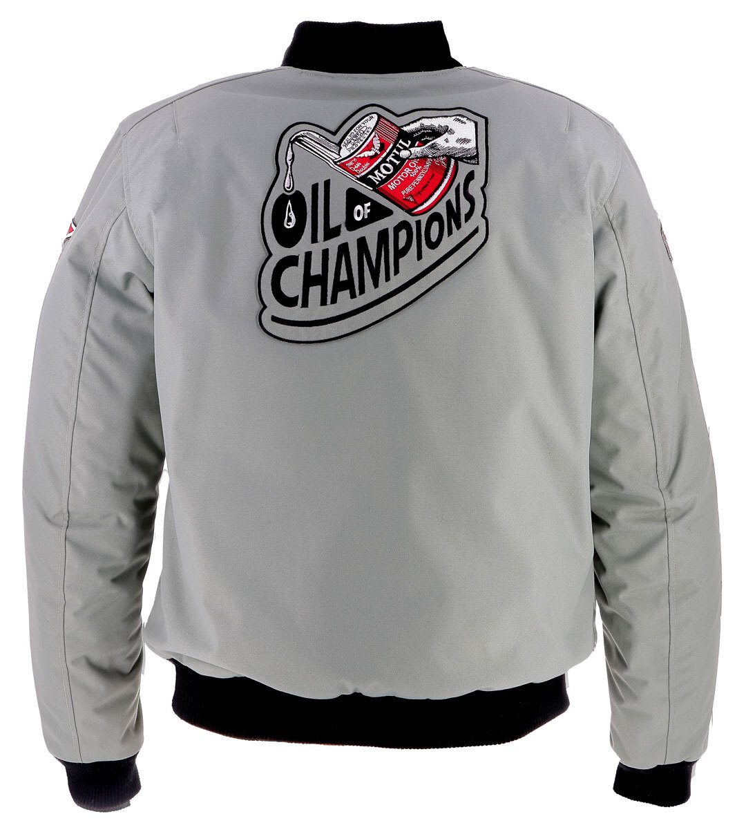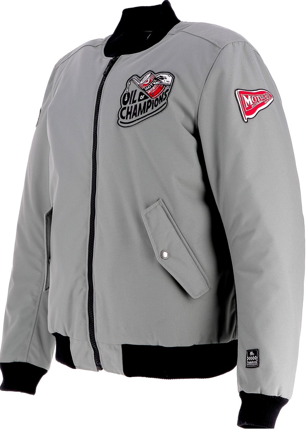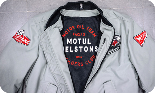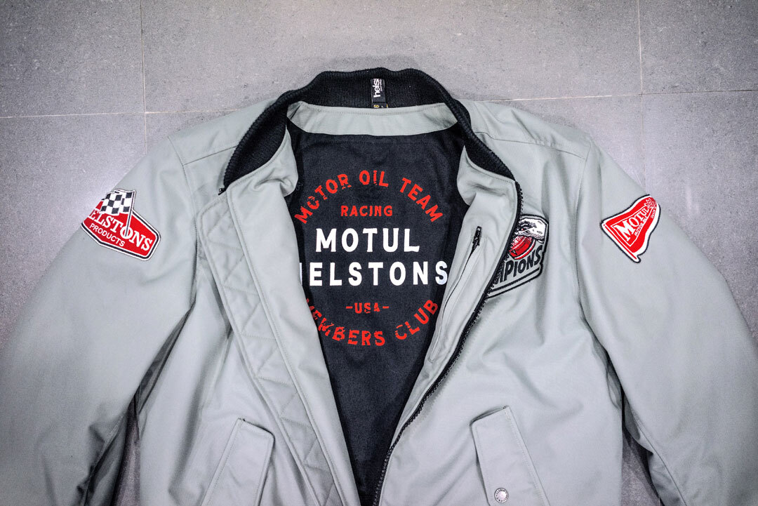 Она представляет собой винтажную куртку-бомбер, украшенную великолепными вышитыми нашивками брендов Helstons и Motul.