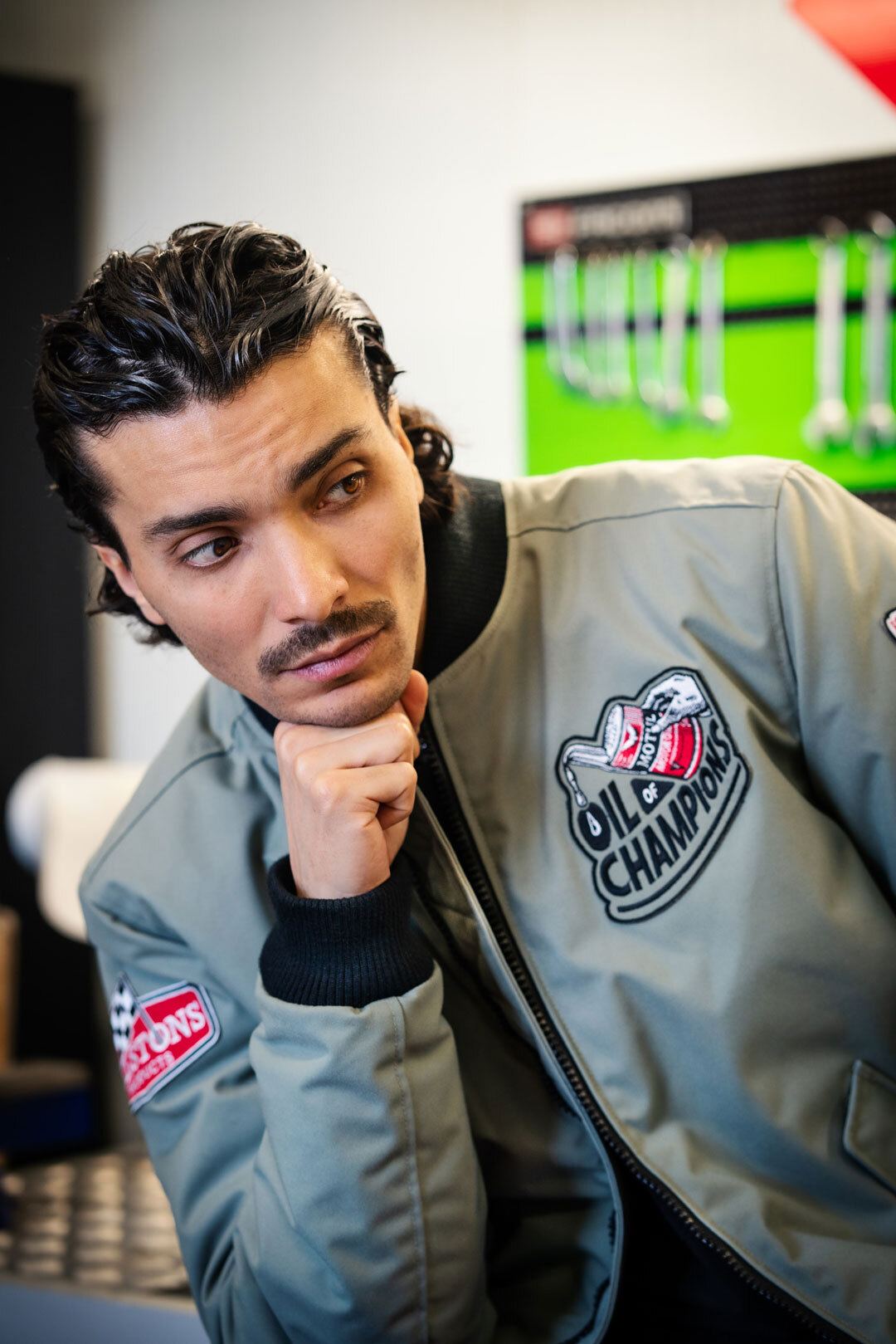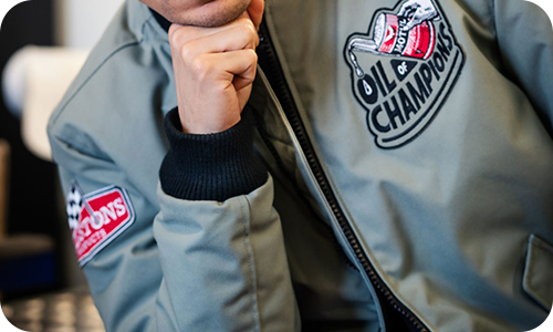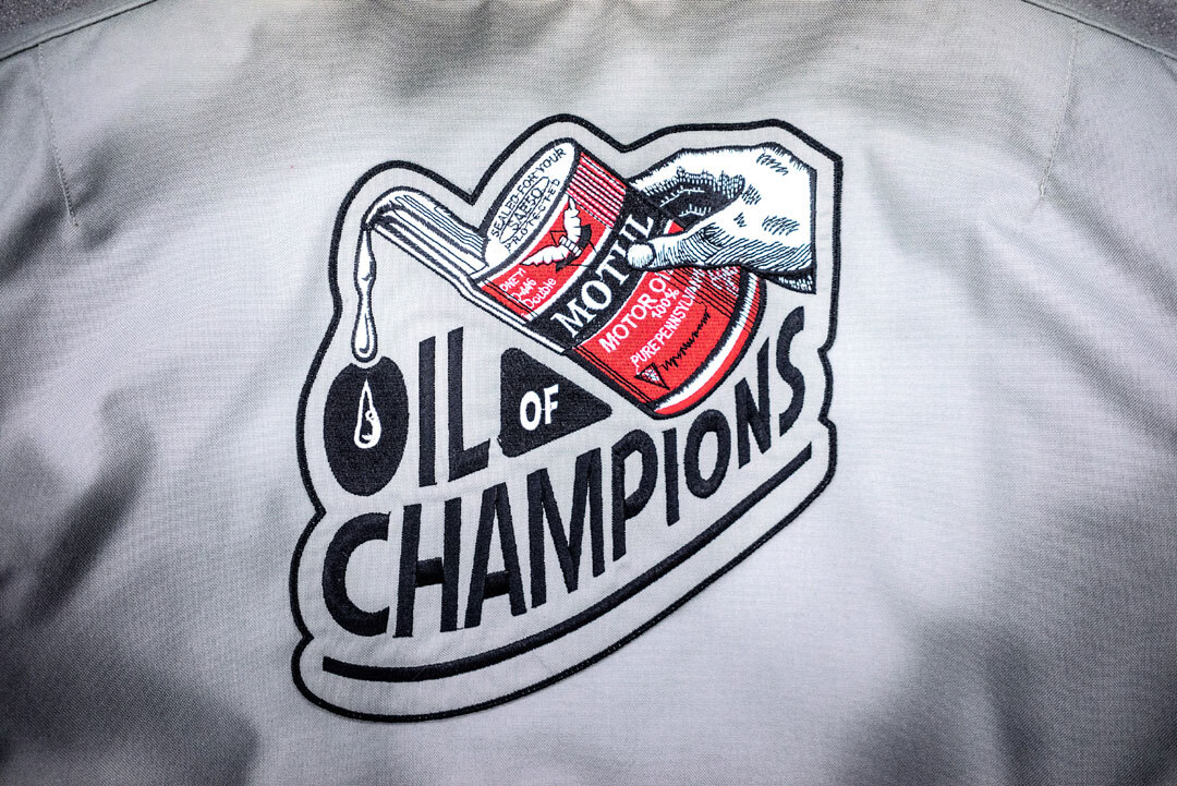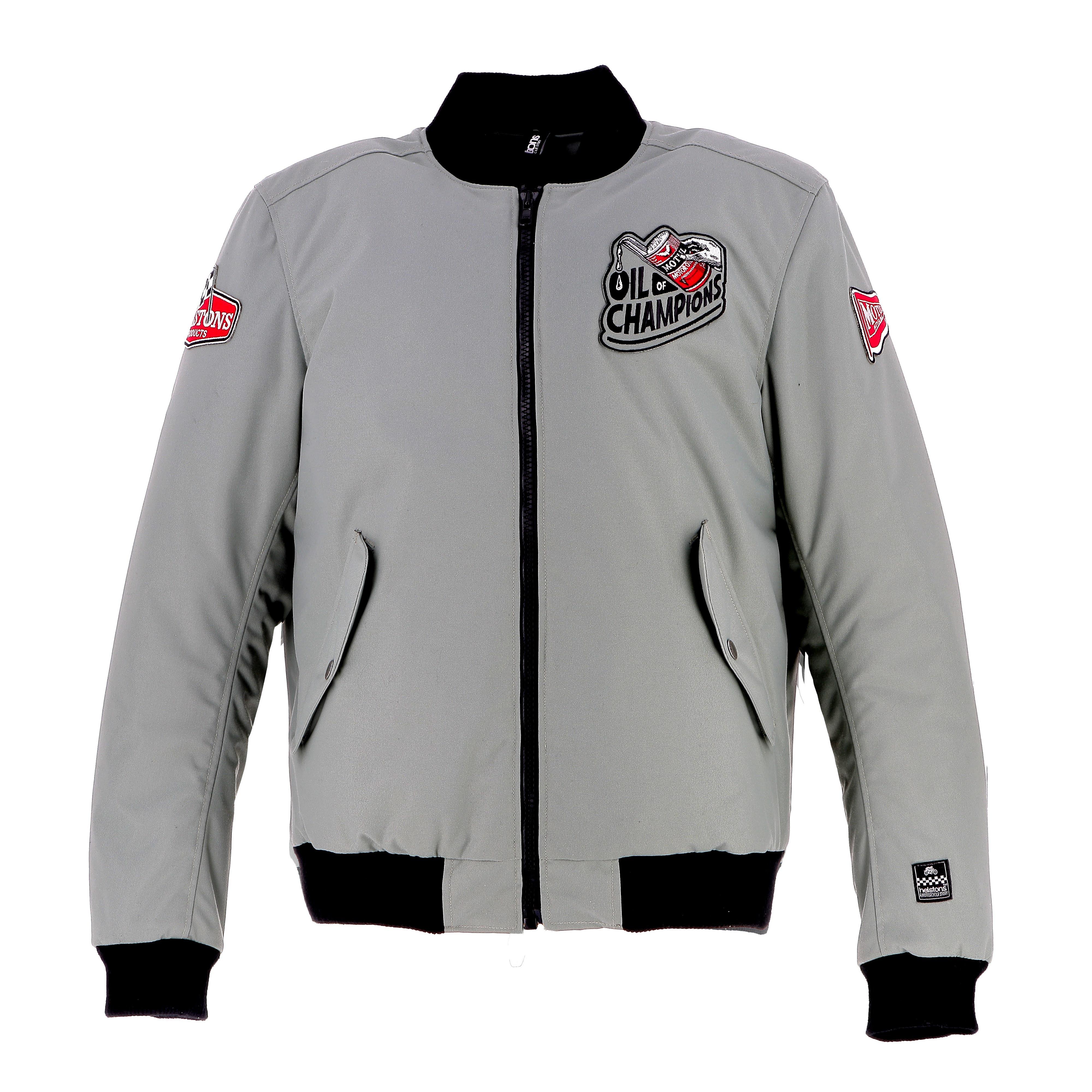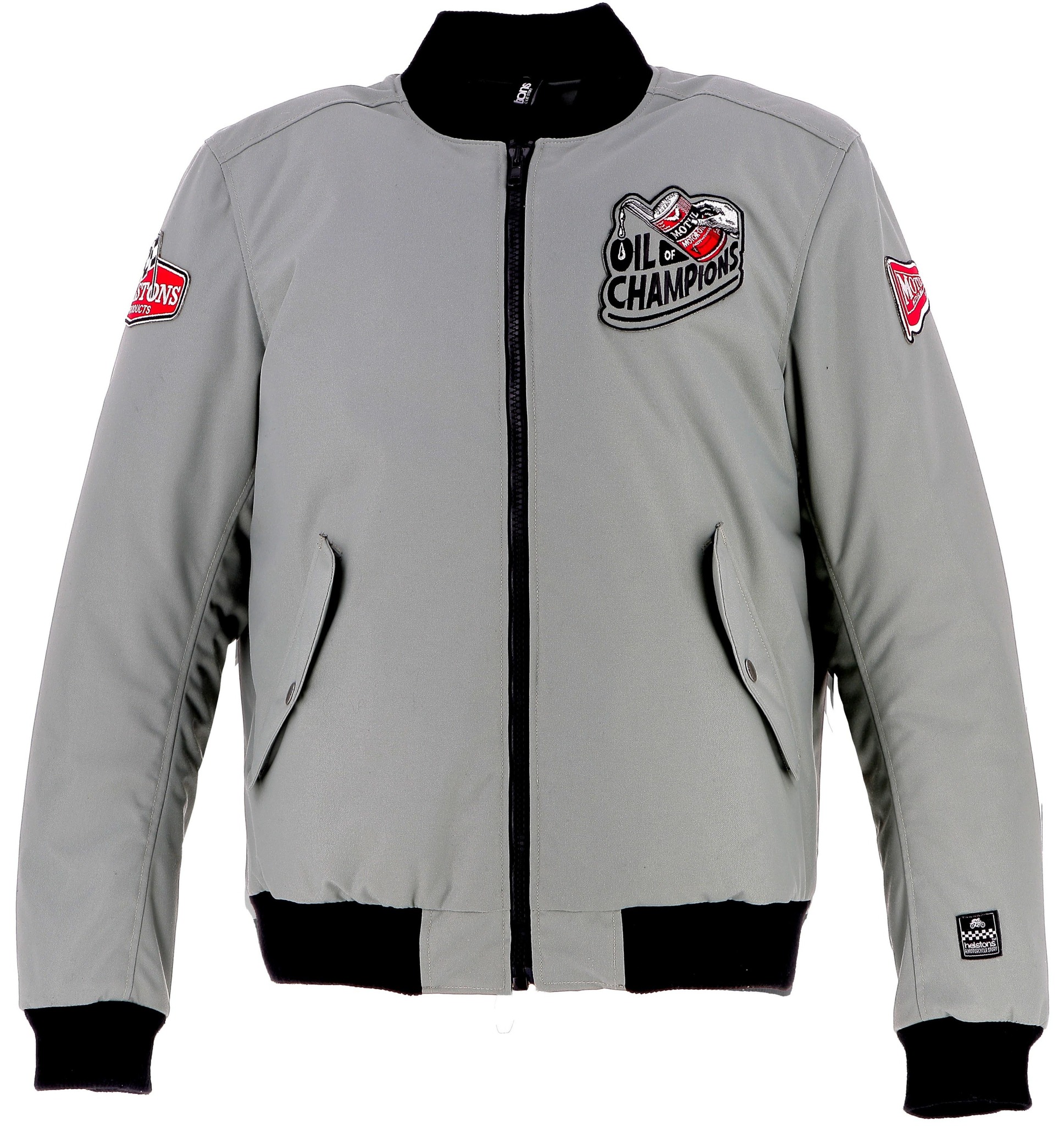 Она представляет собой винтажную куртку-бомбер, украшенную великолепными вышитыми нашивками брендов Helstons и Motul.