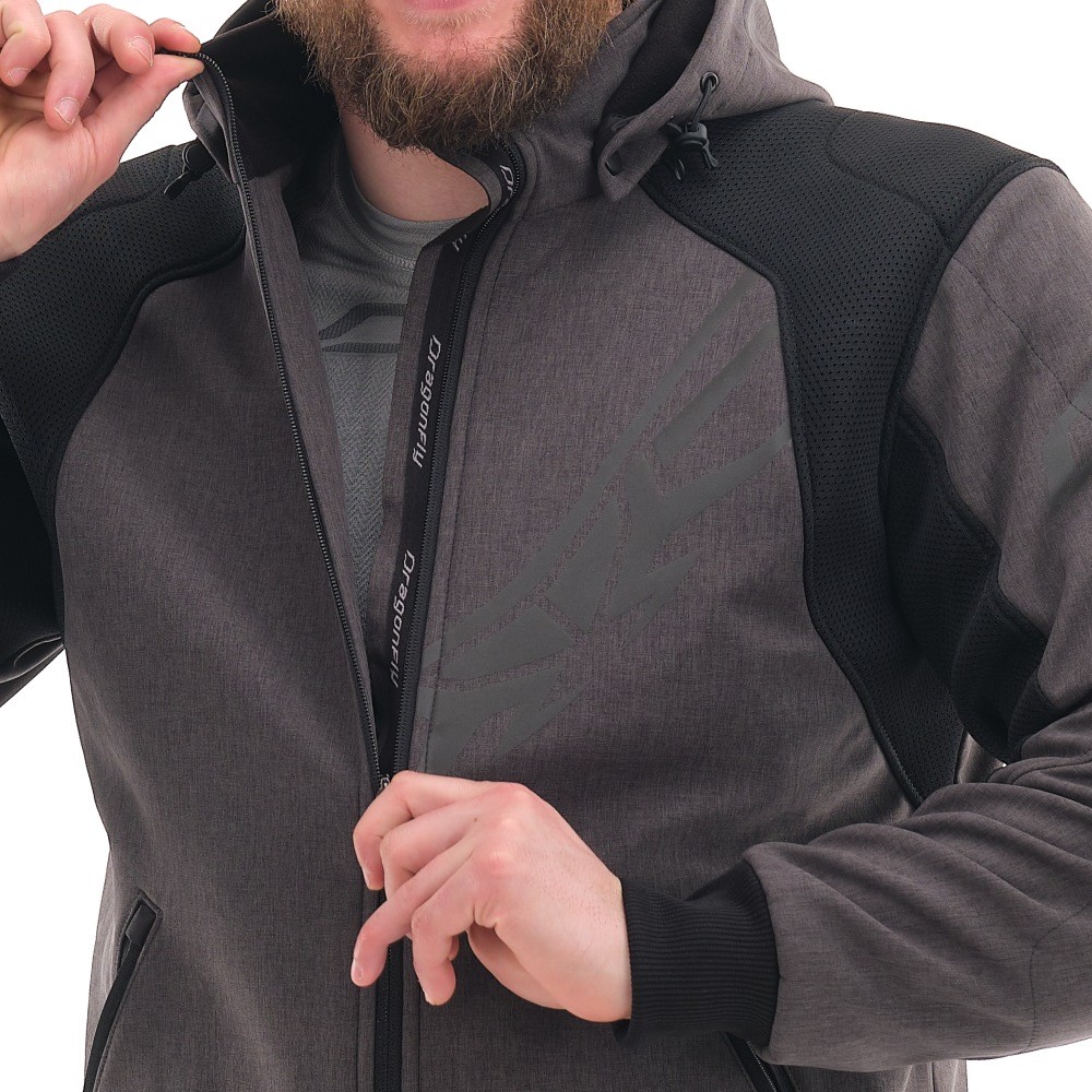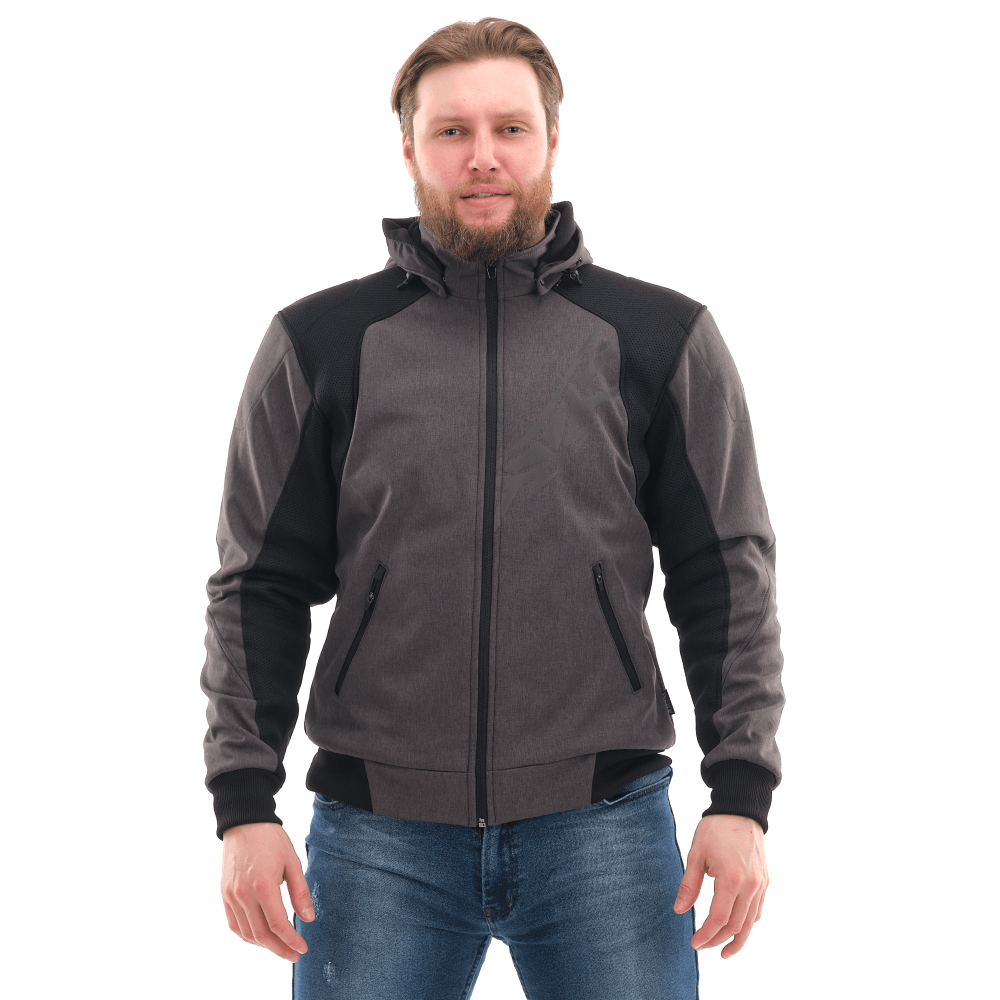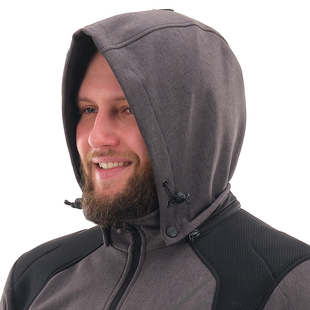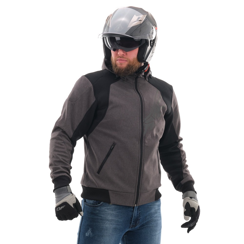 Основа изделия — технологичный Softshell с мембраной 10000/5000, который надежно защищает от ветра и легкого дождя, отводя лишнюю влагу. Вставки из сетки 3D Air-mesh обеспечивают эффективную вентиляцию и смягчают давление лямок рюкзака. Благодаря этому толстовка для мотоциклиста поддерживает комфортный микроклимат в диапазоне от +5 до +25°C. Функционал дополняют съемный регулируемый капюшон, четыре кармана с усиленными молниями и петля для крепления к штанам, исключающая задирание спины.