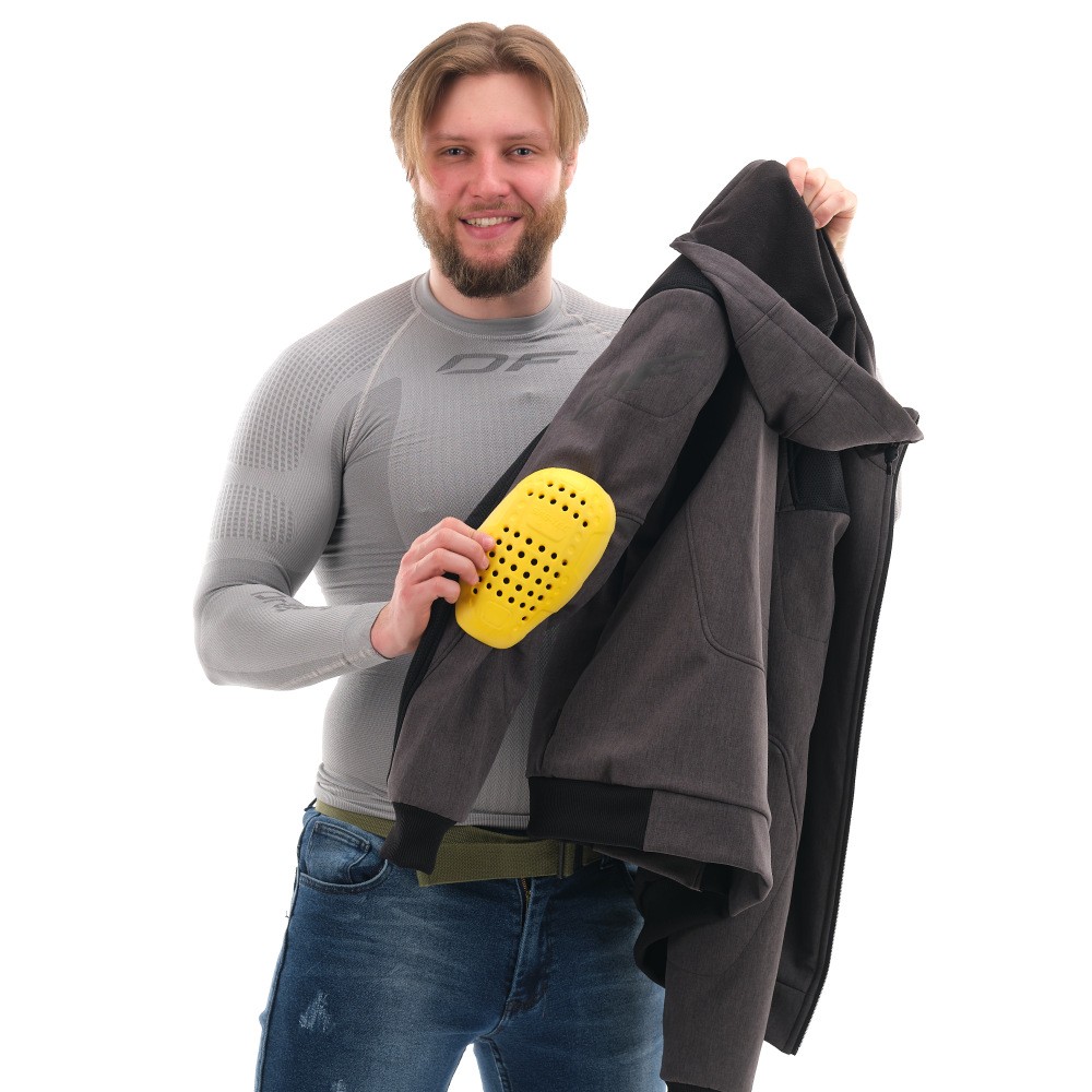 Безопасность — ключевое преимущество DF Urban. Это надежное мотохуди с кевларом (используется арамидная ткань TERAMID) в зонах повышенного риска. В комплекте уже установлены премиальные протекторы плеч и локтей ImpacTec с возможностью регулировки положения. Также предусмотрен карман для защиты спины. Эта байкерская толстовка — популярная модель, заслужившая доверие покупателей за свою долговечность и практичность. Уход прост: протекторы легко вынимаются перед стиркой.