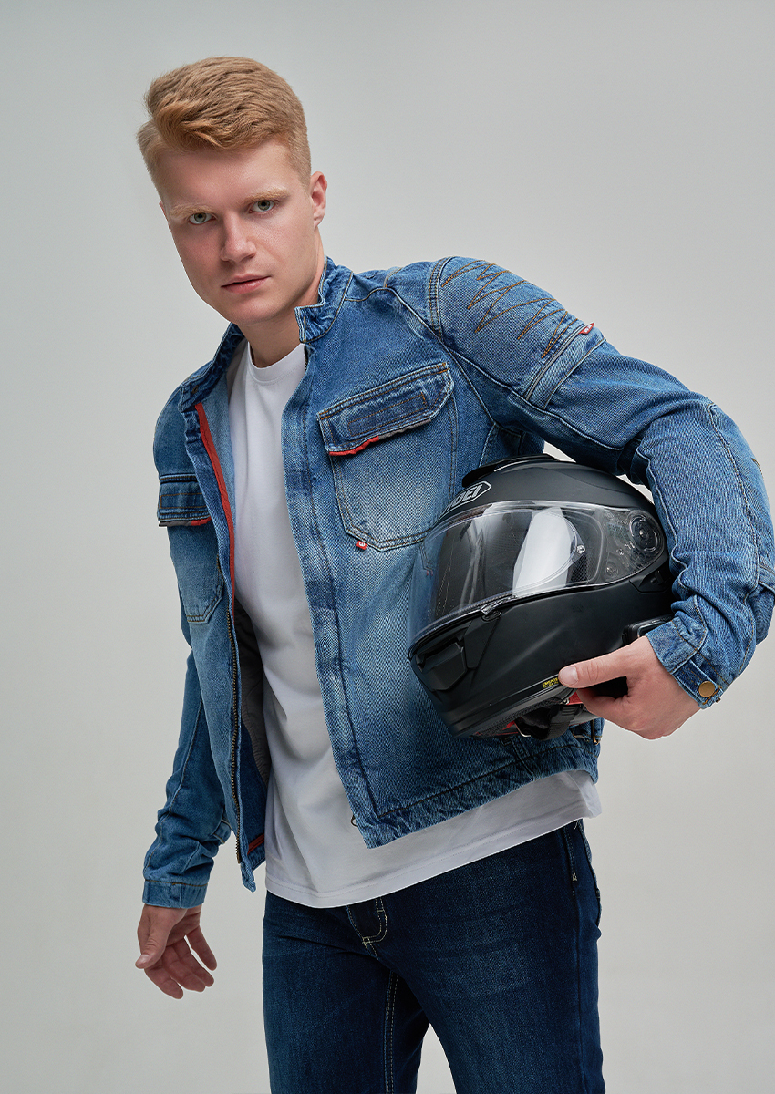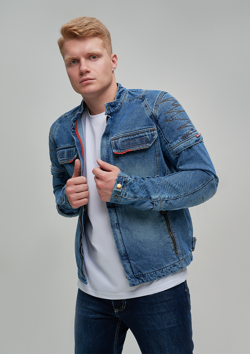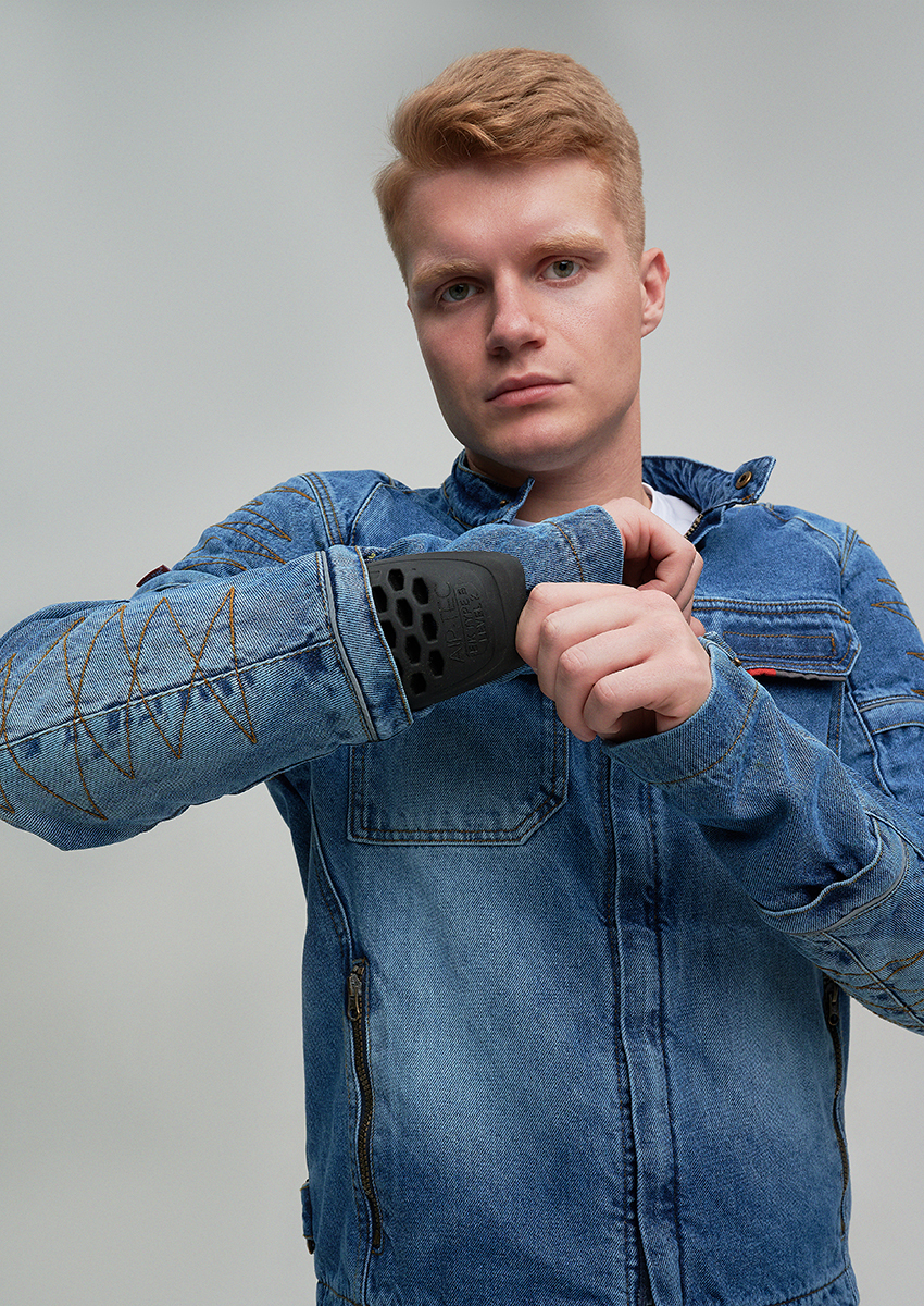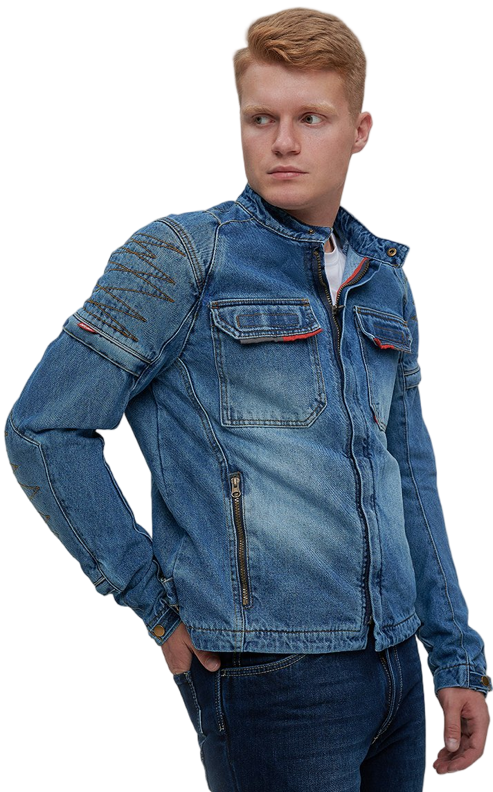 В основе — оригинальный плотный деним 14oz, который придает куртке не только привлекательный внешний вид, но и обеспечивает высокую износостойкость. Для усиления критически важных зон (спина, внешние части рук) применены арамидные вставки (2-й слой), известные своей исключительной прочностью и устойчивостью к истиранию. Третий слой — мягкий приятный к телу подклад, перекрывающий арамид, обеспечивает дополнительный комфорт.