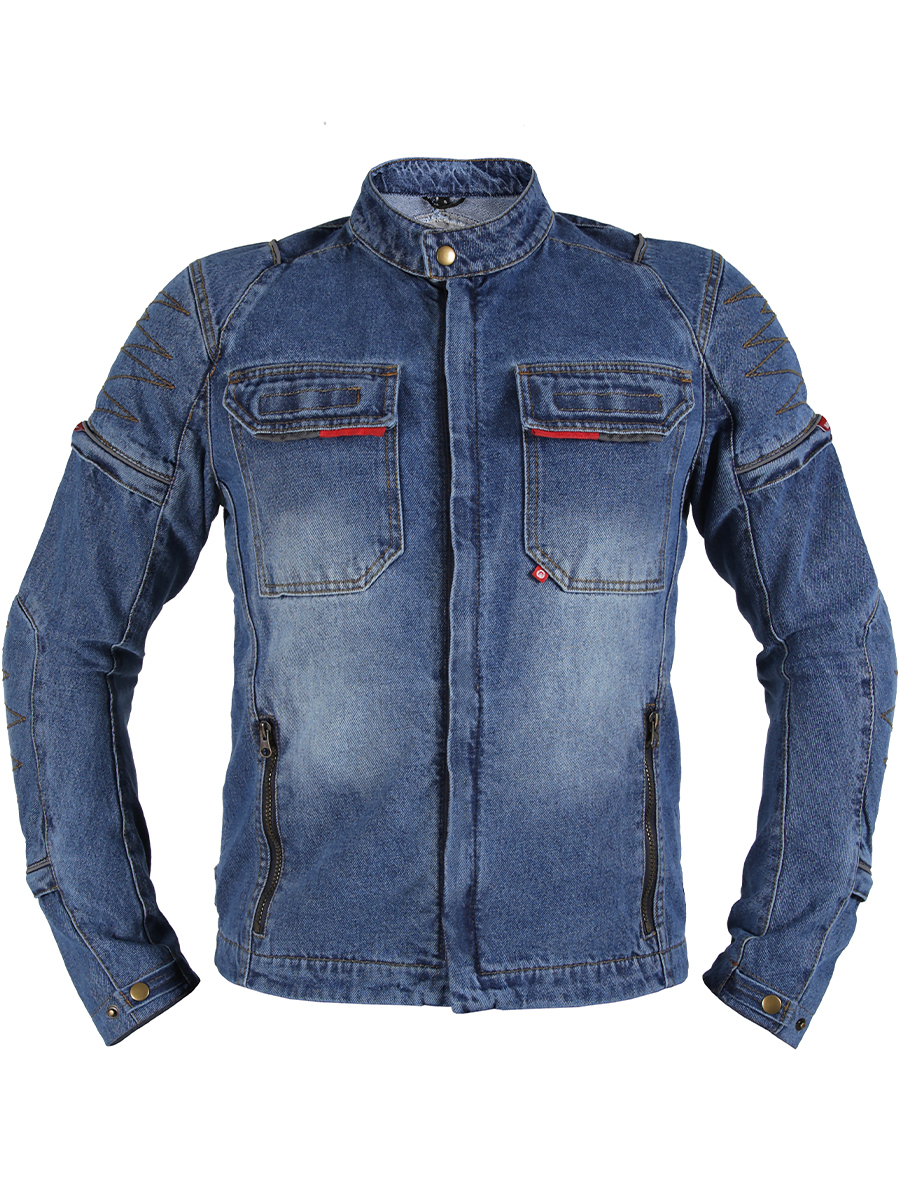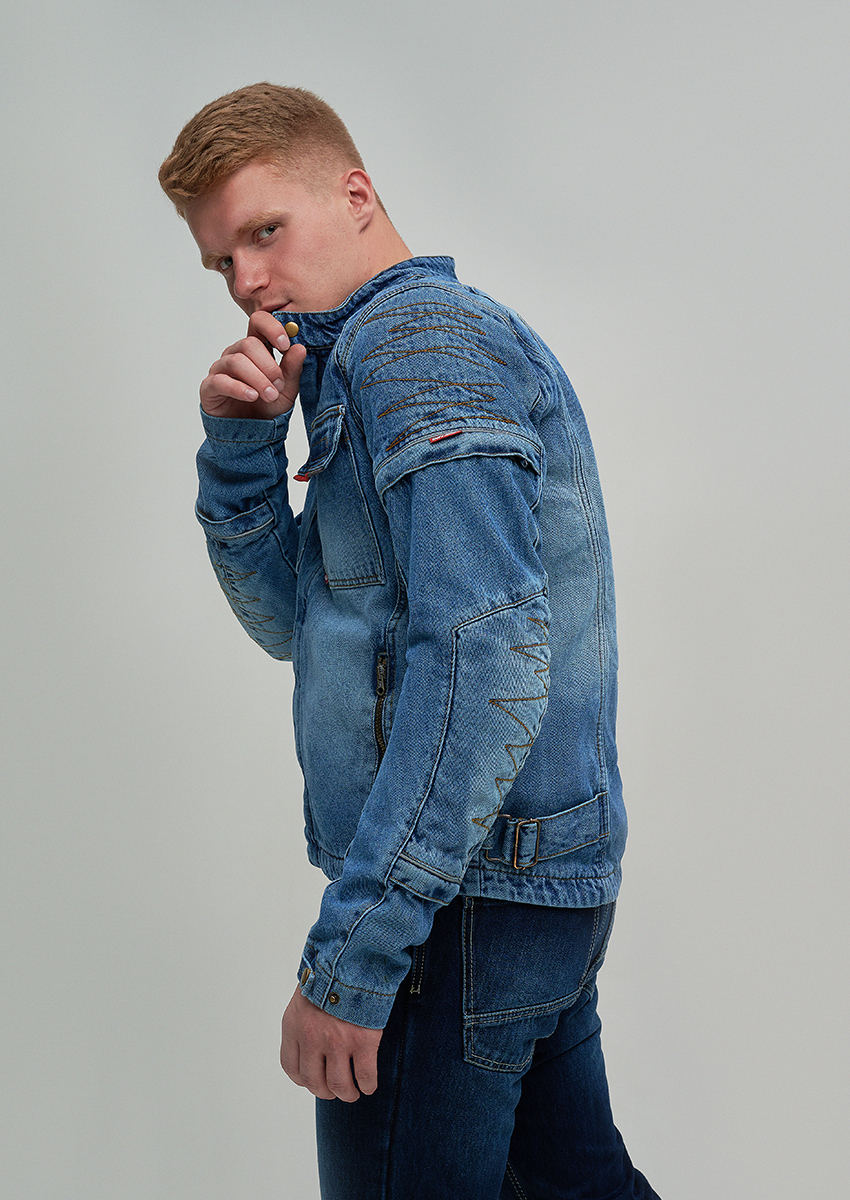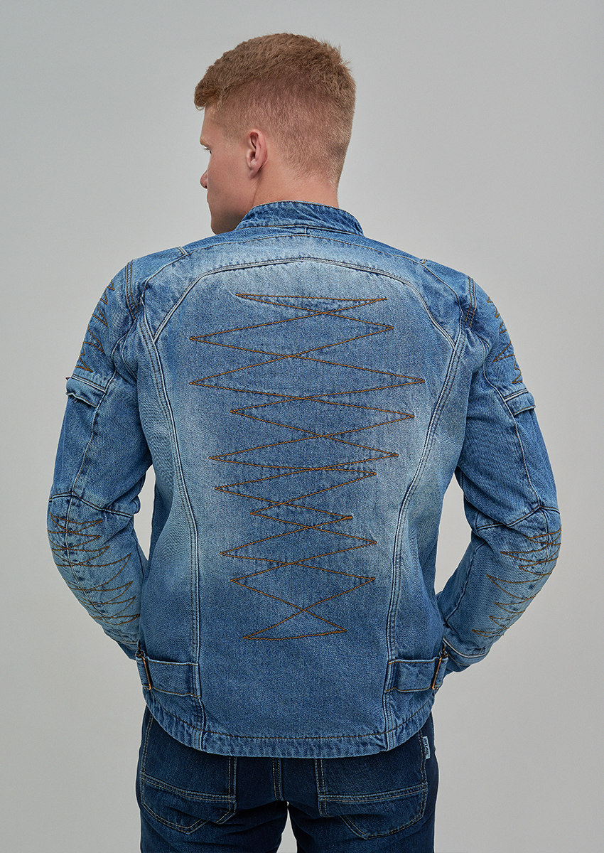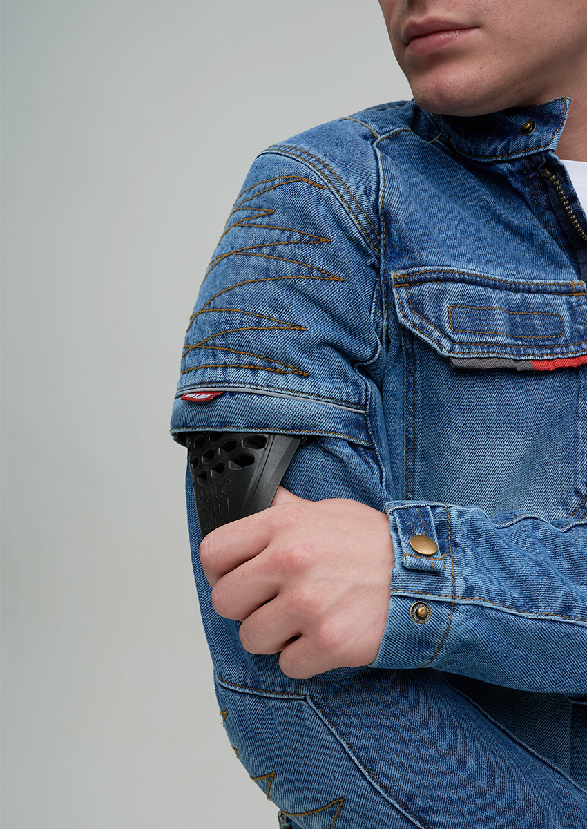 В основе — оригинальный плотный деним 14oz, который придает куртке не только привлекательный внешний вид, но и обеспечивает высокую износостойкость. Для усиления критически важных зон (спина, внешние части рук) применены арамидные вставки (2-й слой), известные своей исключительной прочностью и устойчивостью к истиранию. Третий слой — мягкий приятный к телу подклад, перекрывающий арамид, обеспечивает дополнительный комфорт.