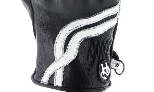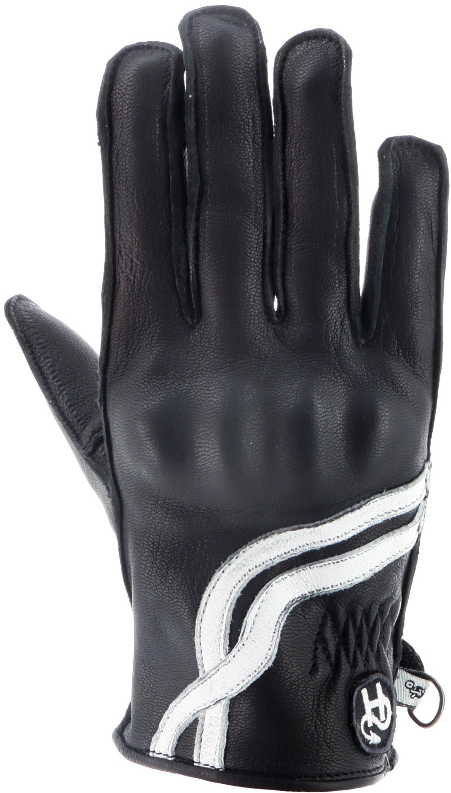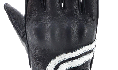 Женские мотоциклетные перчатки изготовлены из мягкой чёрной кожи и украшены белыми декоративными полосками.