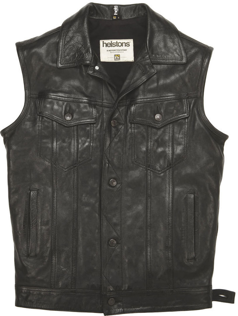 Мужской кожаный мотожилет Helstons Waist Plain Gilet на молнии. Сшит из эластичной и прочной воловьей кожи толщиной 0,9–1 мм на мягкой хлопковой подкладке. Кожа устойчива к растяжениям и усилию на разрыв. За счет слегка мятой фактуры кожи модель придает образу брутальность, подчеркивает класс и статус.