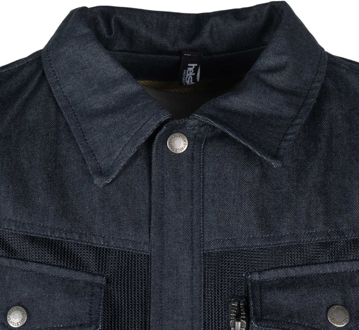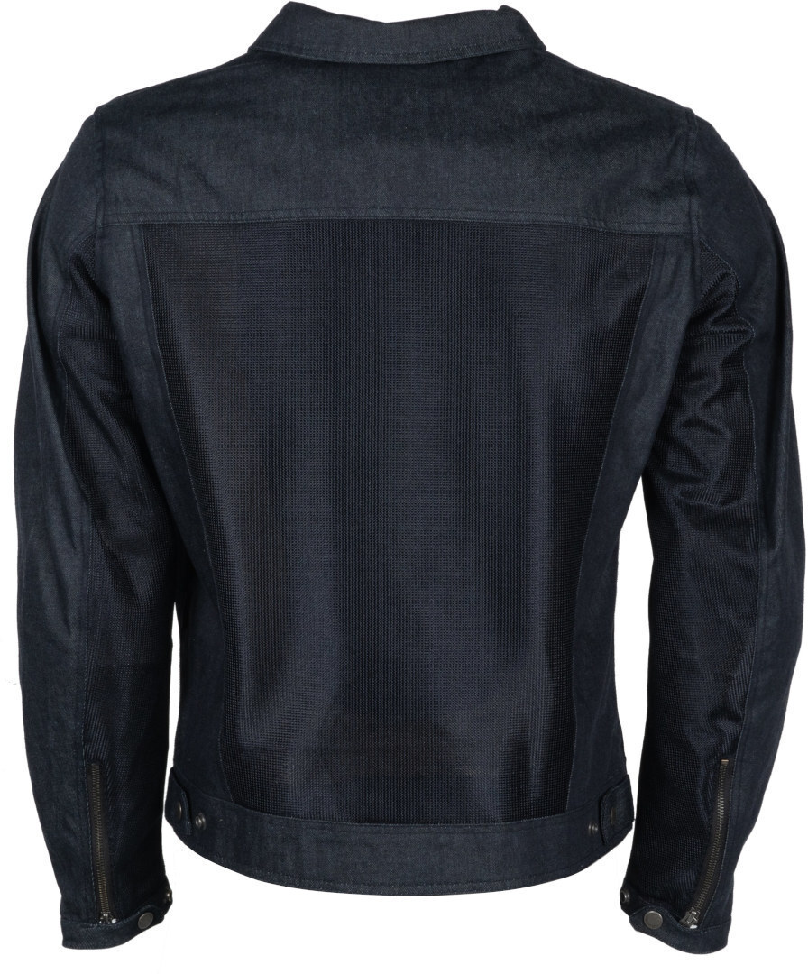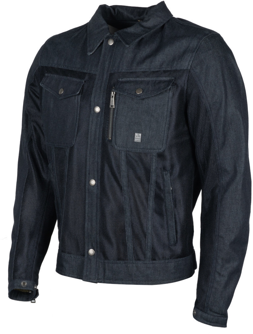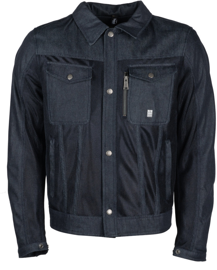 Синяя сетчатая мотоциклетная куртка Helstons Western Air из хлопка - это экипировка, разработанная специально для лета. Куртка выполнена в винтажном джинсовом стиле и сочетает в себе хлопковые элементы и вентилируемые участки из воздухопроницаемой сетки. В комплекте предусмотрен отдельный дождевик, укладывающийся в специальный кармашек в задней части куртки. Имеется центральный замок-молния с планкой на кнопках, два врезных боковых кармана, один карман для бумажника на молнии, а также два нагрудных кармана с клапанами, на одном из которых ярлычок с изображением мотоцикла.