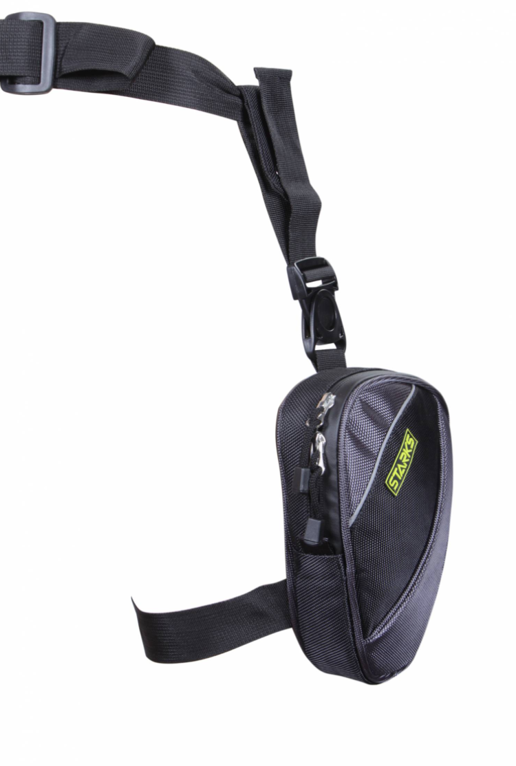 Аксессуар крепится к защитной экипировке при помощи ремней 2 способами — на талии и на бедрах. Использование для пошива ниток с водоотталкивающей обработкой полностью исключает вероятность намокания поверхности материала. Для повышения пассивной безопасности предусмотрены светоотражающие элементы. Данная модель способна обеспечить абсолютную защиту содержимого от воды, пыли и грязи.