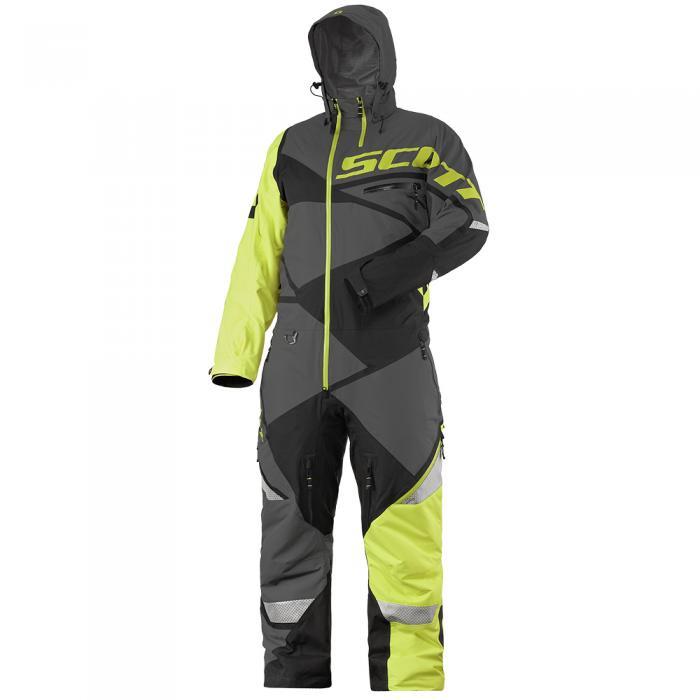 Комбинезон дополнительно утеплен термонакладками в области колен и в месте соприкосновения тела с сиденьем. Фронтальную молнию YKK Aquaguard и дополнительные по бокам штанин легко расстегнуть, не снимая перчаток. Съемный капюшон крепится к мягкому воротнику. Внутренние подтяжки регулируются. Яркая черно-желтая расцветка моносьюта дополнена светоотражающими вставками для большей безопасности райдера на дороге.