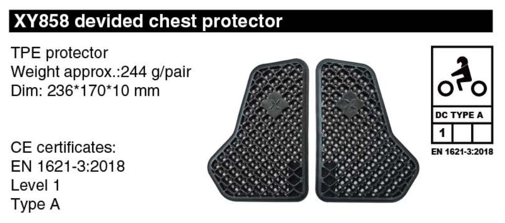 Эта защита груди CE сертифицирована по стандарту CE (DC Type A) и соответствует уровню защиты LEVEL 1 по европейской сертификации TUV, что подтверждает ее исключительную эффективность. При весе всего 244 грамма и компактных размерах 236 x 170 x 10 мм, вставка практически незаметна под одеждой, но при этом обеспечивает уверенность в каждой поездке. В комплекте поставляется удобный чехол для хранения.